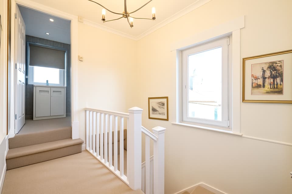 At ground-floor level, a welcoming hall leads to a generously proportioned open-plan kitchen/snug/dining room, forming the sociable heart of the home. The kitchen is a standout feature — a bespoke installation by “East Neuk Kitchens”, offering sleek cabinetry, quality finishes, and excellent workspace, with ample room for dining and relaxed family living. A separate bay-windowed living room provides a cosy yet elegant retreat, filled with natural light.