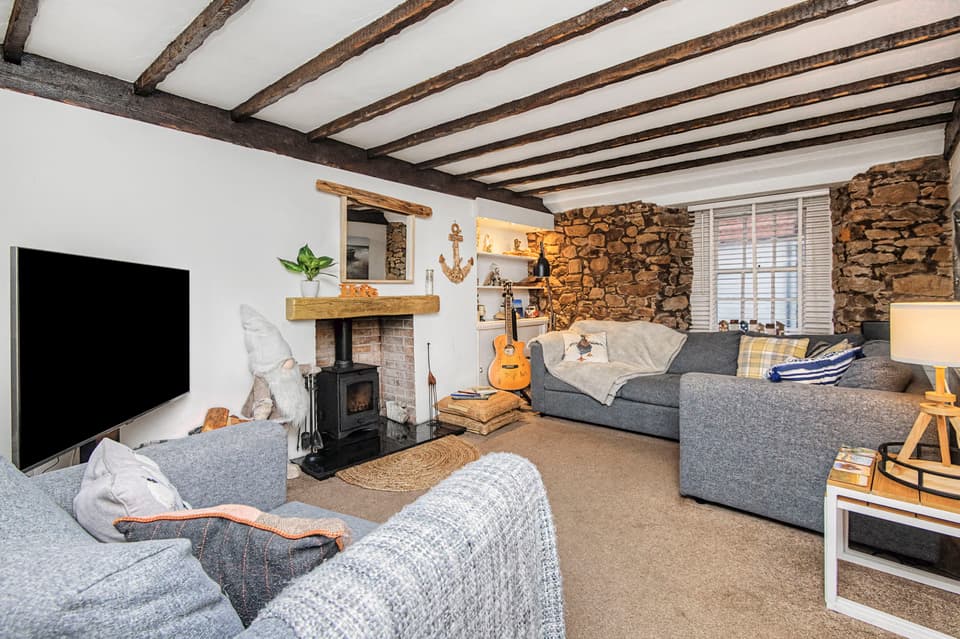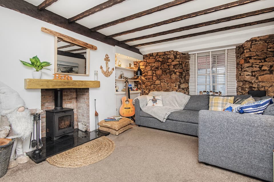 Wood-burning stove in living room.