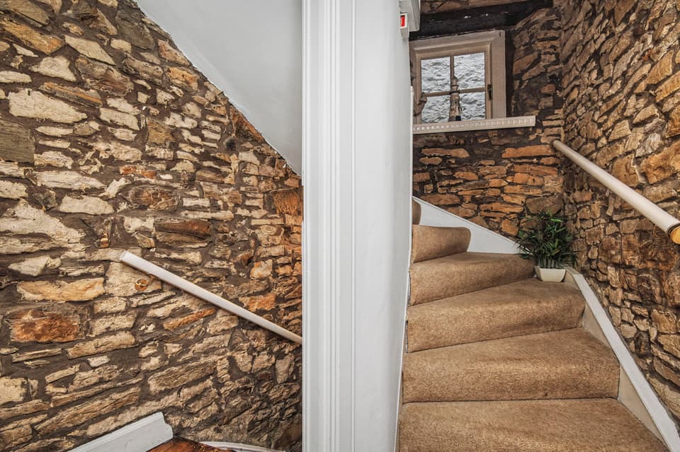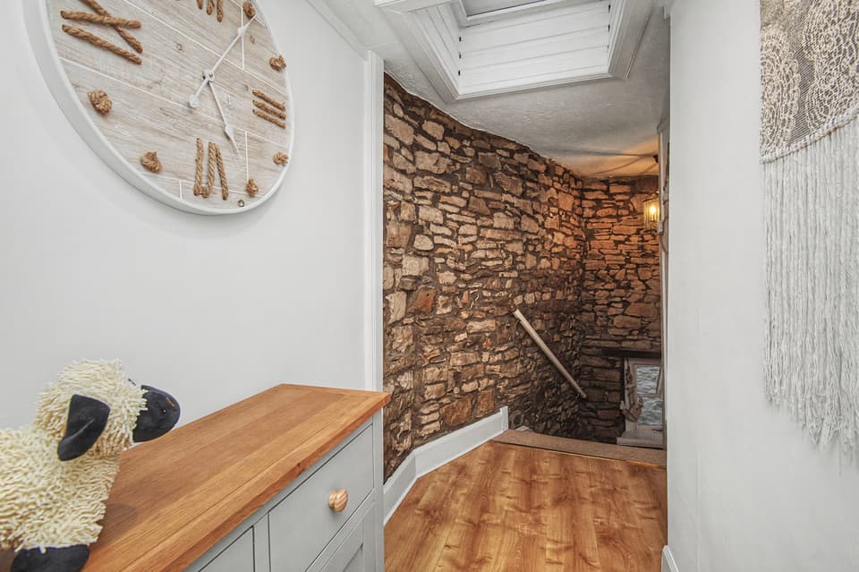 Character features including exposed stone and beams.