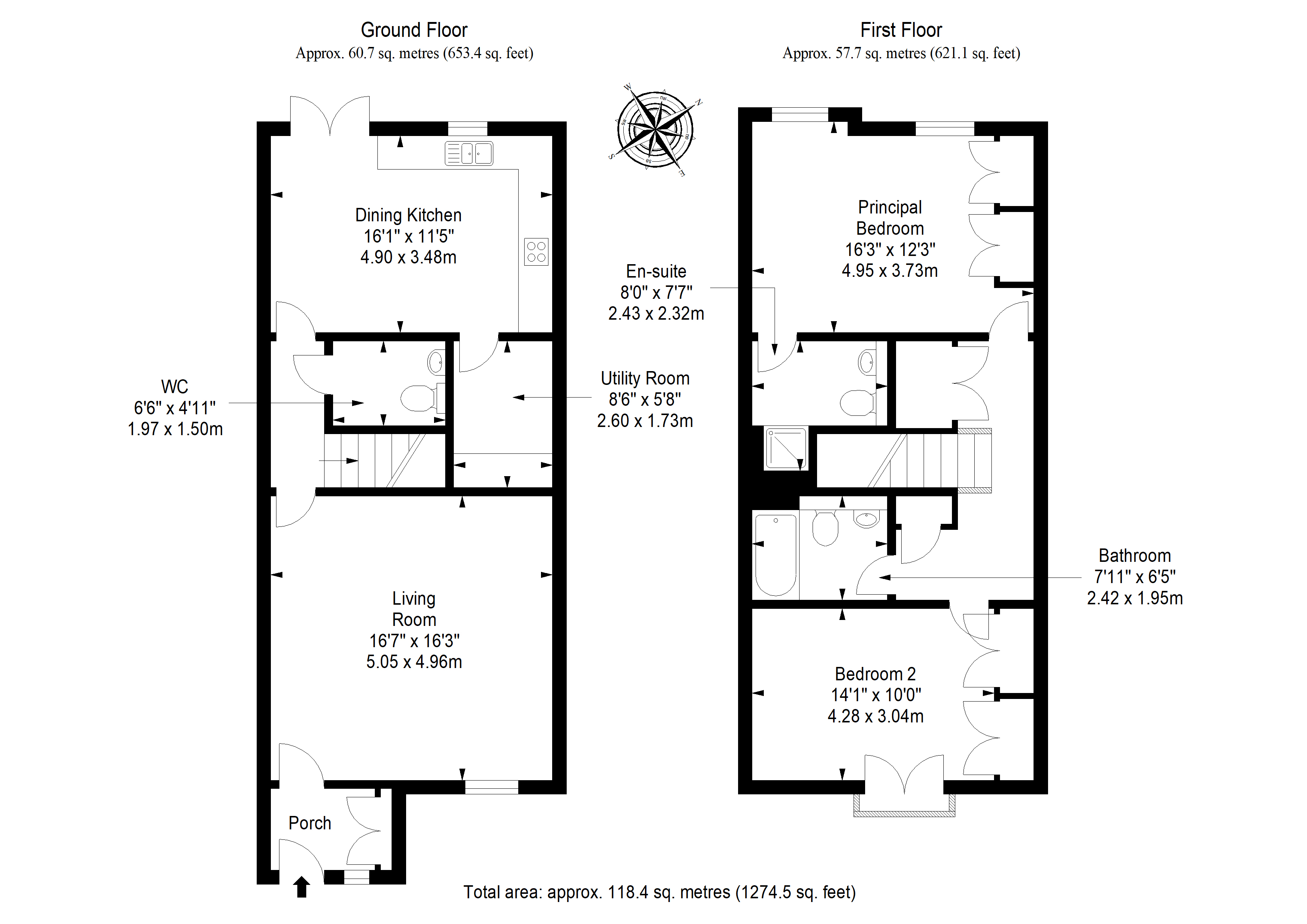 A well-presented two-bedroom mid-terrace house arranged over two levels, offered in fresh decorative order with recently replaced flooring throughout. The property comprises a spacious living room, modern dining kitchen with patio doors, utility room, ground floor WC, two generous double bedrooms including a principal bedroom with refurbished en-suite, and a family bathroom. Further benefits include a new front door, gas boiler installed in 2020, replaced gas hob and integrated fridge freezer, and a private sun-trap rear garden. The property extends to approximately 118.4 sq m (1,274.5 sq ft). Factoring fee is approximately £500 per annum.