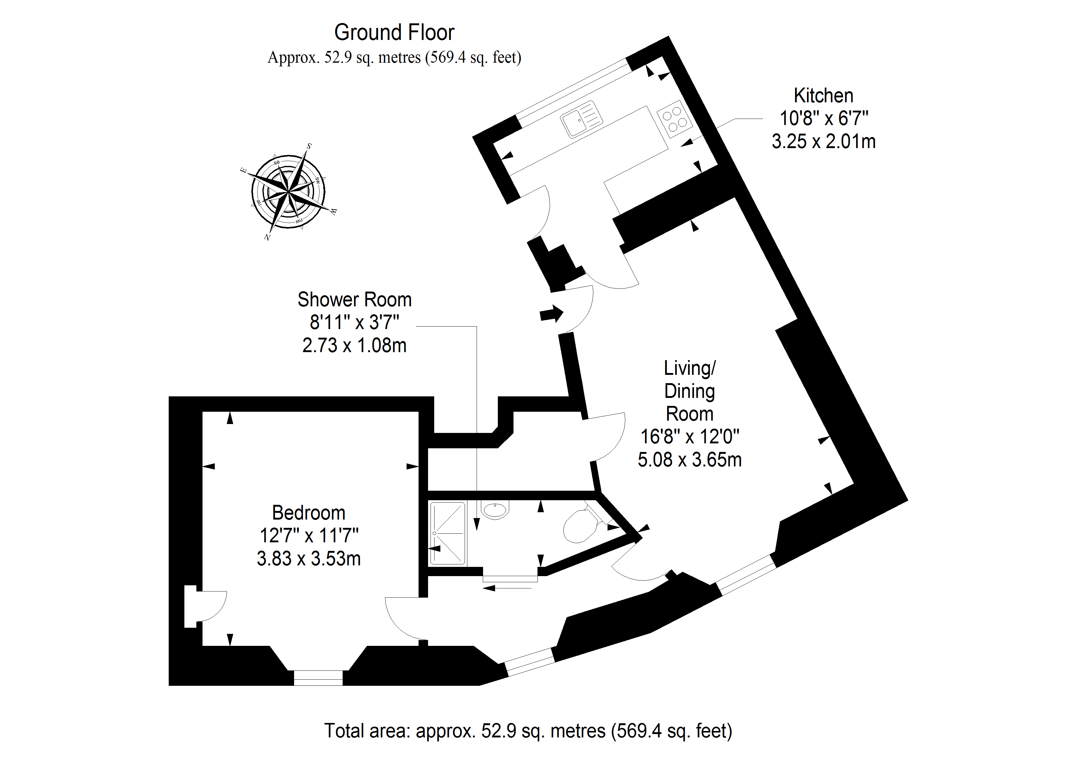 A charming one-bedroom ground floor property featuring a spacious living/dining room, modern fitted kitchen, double bedroom, and contemporary shower room. The accommodation extends to approximately 52.9 sq. metres (569 sq. ft.) and benefits from a communal enclosed garden area to the rear, offering both lawn and patio space.