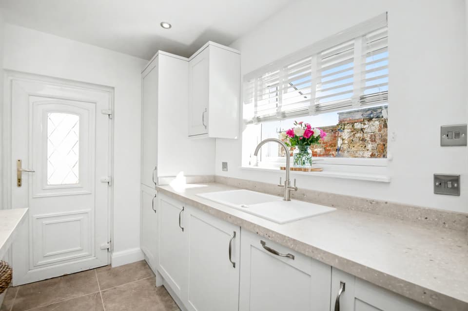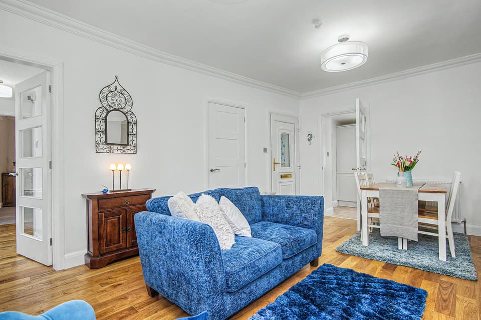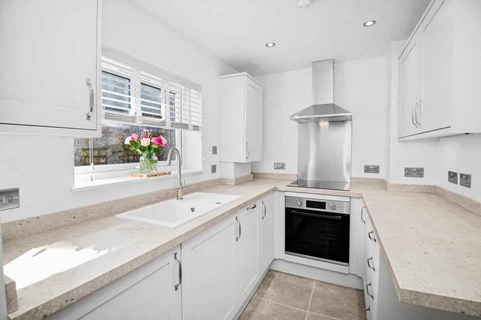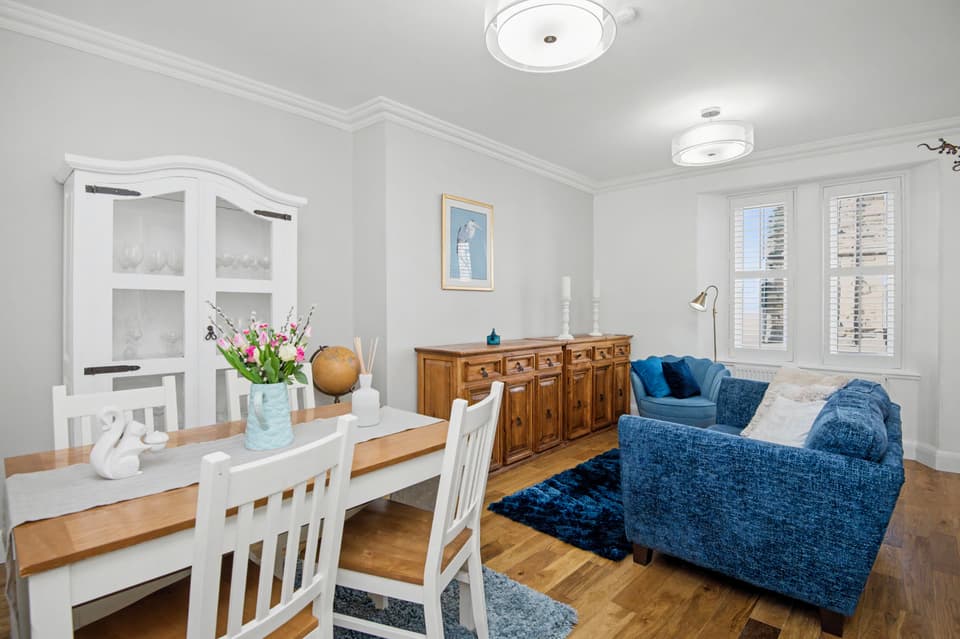 The accommodation is thoughtfully arranged, with a bright and generously proportioned living and dining room forming the heart of the home. This inviting space benefits from excellent natural light and provides ample room for both relaxing and entertaining. The adjoining newly fitted kitchen is modern in design, featuring sleek cabinetry, integrated appliances, and practical worktop space.