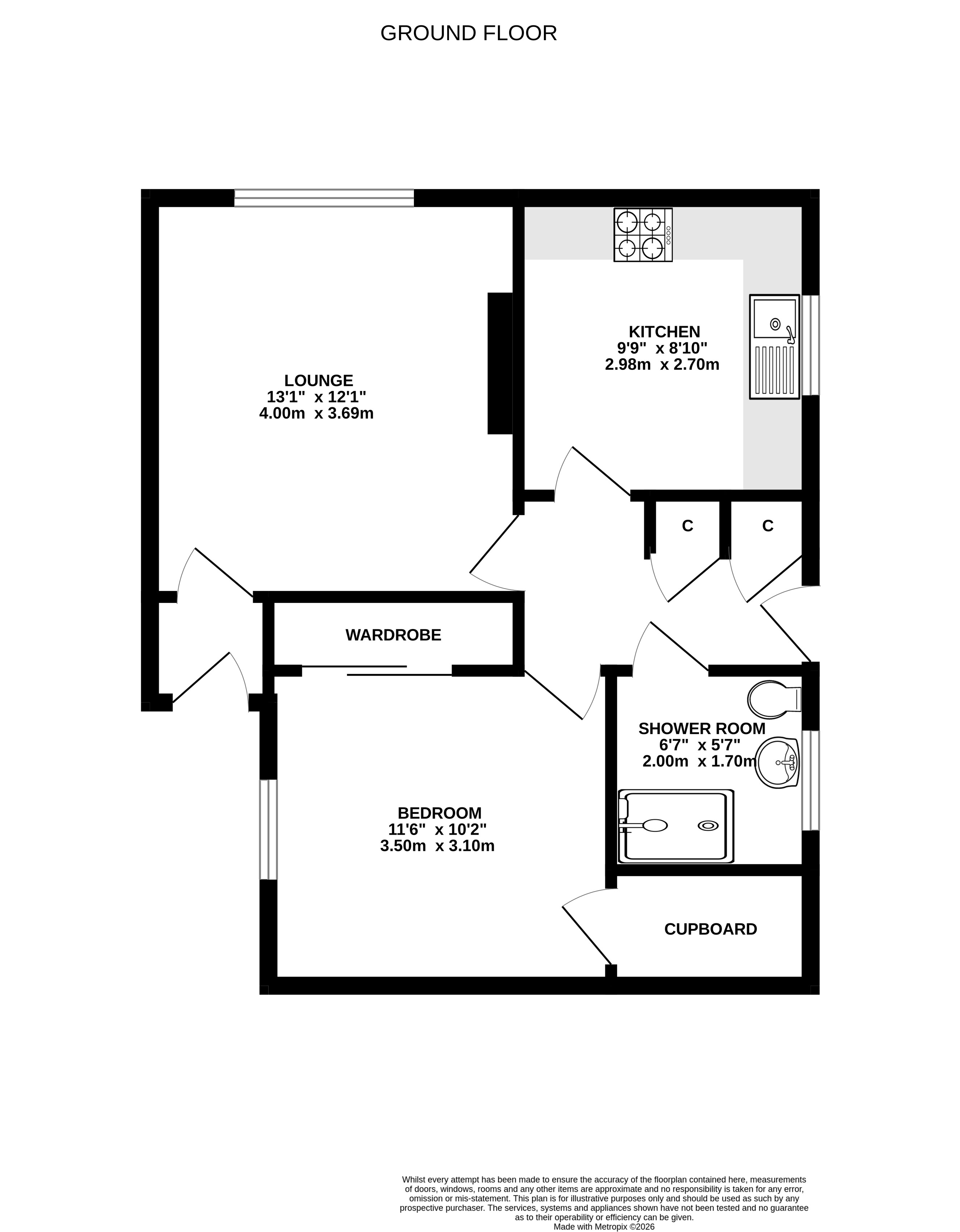 Accommodation comprises an entrance vestibule with a cupboard housing the electrics, leading into a bright and spacious lounge with ample room for occasional furniture. A door from the lounge opens to the rear hall, which provides access to the garden and includes two useful storage cupboards. The kitchen is fitted with a selection of wall-mounted and base units, while the double bedroom features two fitted mirrored wardrobes, providing excellent storage. The shower room is equipped with a modern two-piece suite and a separate shower cubicle.