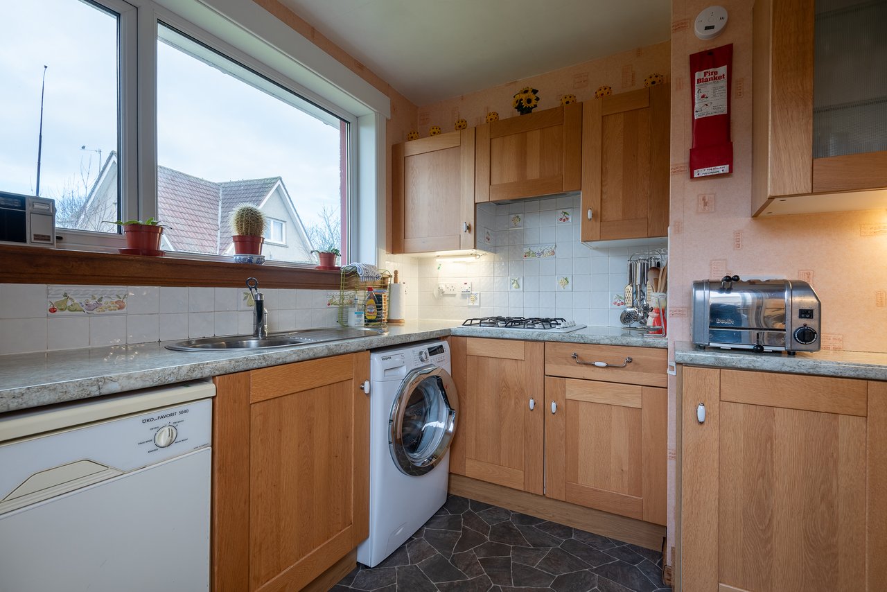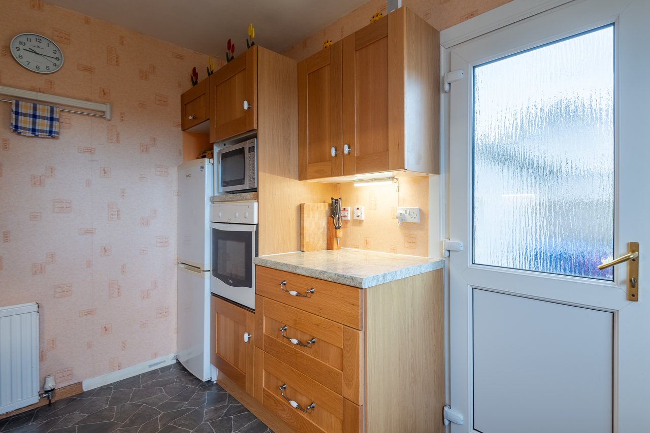 The property benefits from gas central heating and double glazing. Accommodation is accessed via an entrance vestibule leading into a welcoming hallway with two built in storage cupboards. The bright lounge/dining room enjoys an open aspect over the front garden, while the kitchen offers a generous range of fitted units, an attractive outlook to the rear, and direct access to the driveway.