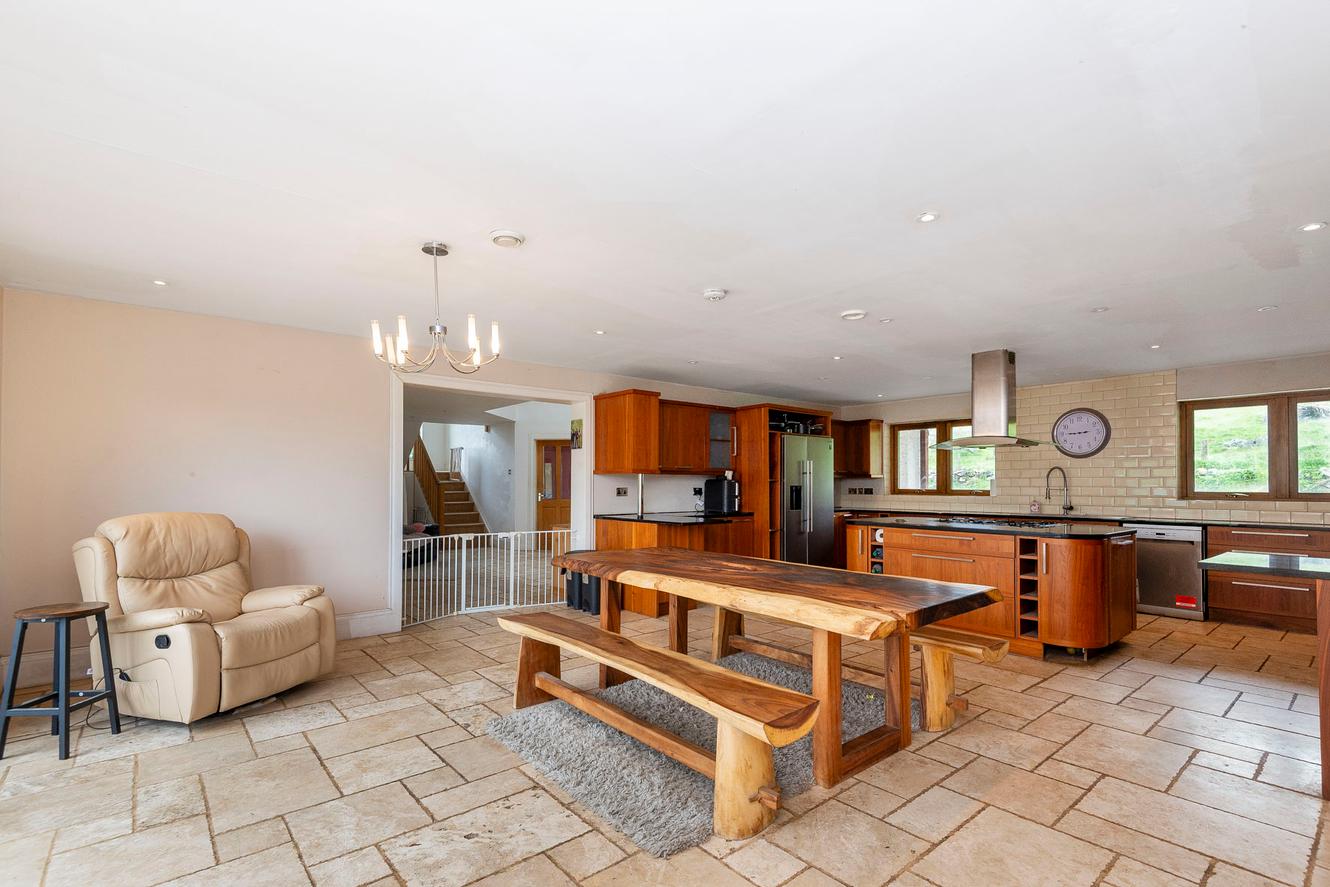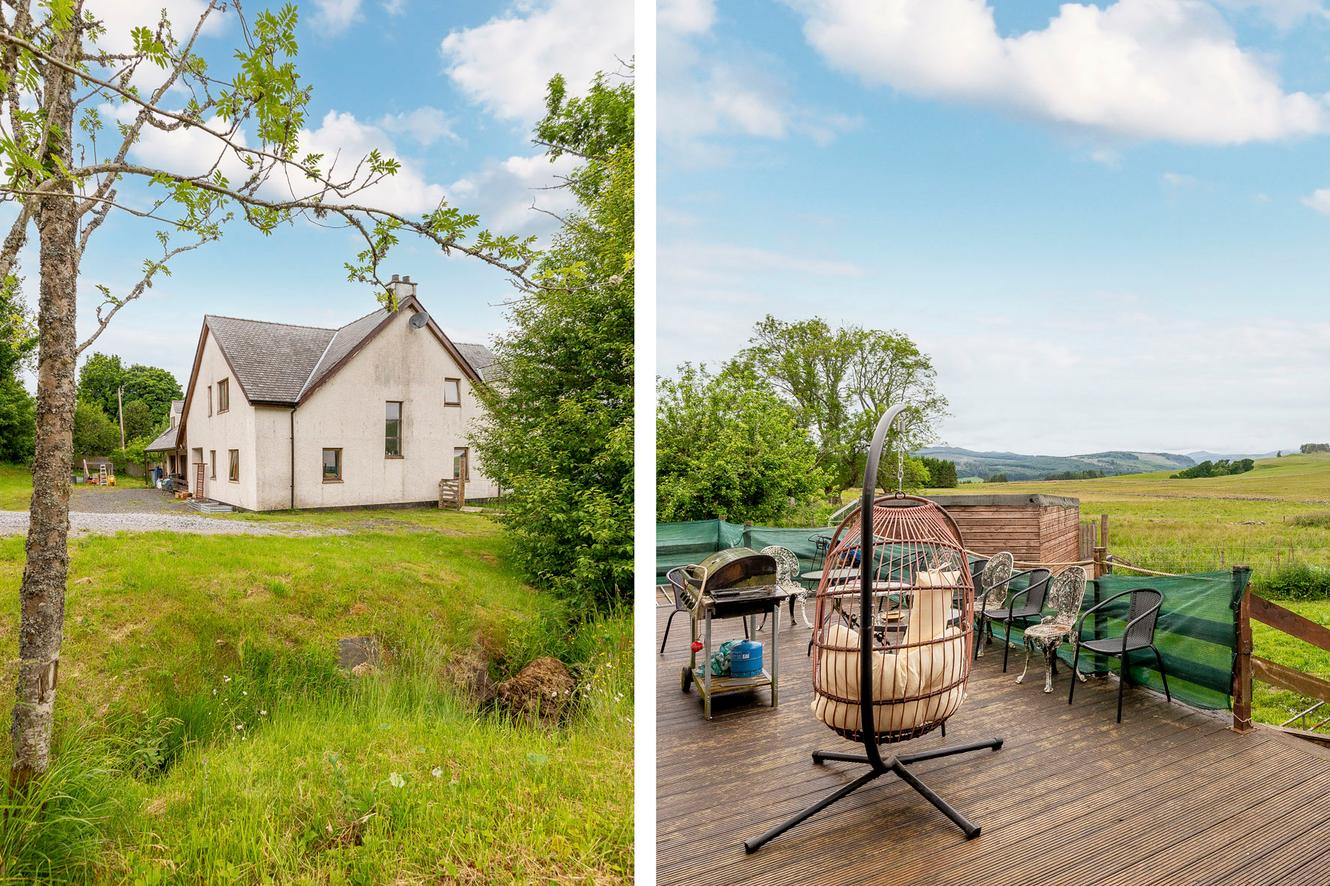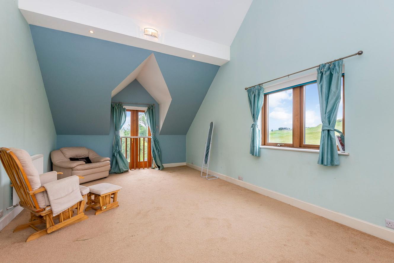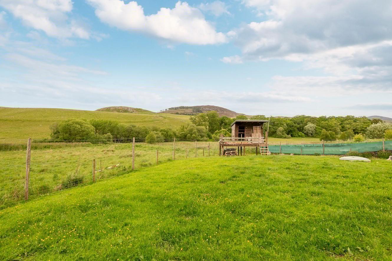 Auchenstroy is encircled by a wealth of garden space that is laid to lawn, creating a private oasis set against the backdrop of rolling fields and hills – a stunning uninterrupted vista to admire whilst relaxing in the sun. To the enclosed rear, a spacious decked area forms the ideal place for alfresco dining, whilst other parts of the wraparound gardens have been sectioned for family use and for raising small livestock animals, such as chickens and goats. A private driveway ensures parking for multiple cars, along with an integral double garage that has access to the kitchen.