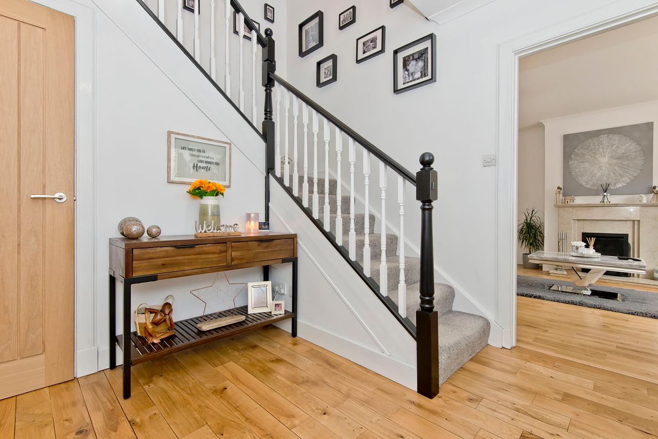 The front door is conveniently tucked under an external porch area and opens into a welcoming hallway, where the home’s tasteful and pristine interiors are immediately introduced, with neutral décor and warm oak flooring. The hall is accompanied by a built-in under-stair storage cupboard and a useful WC.