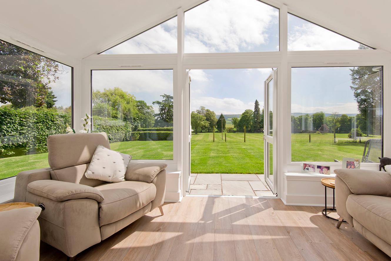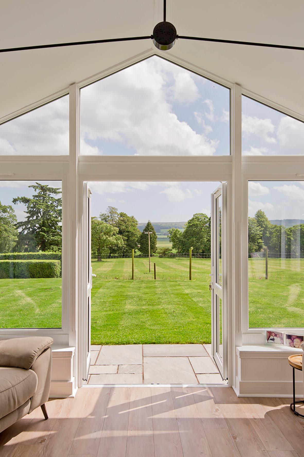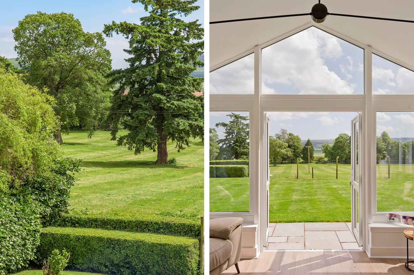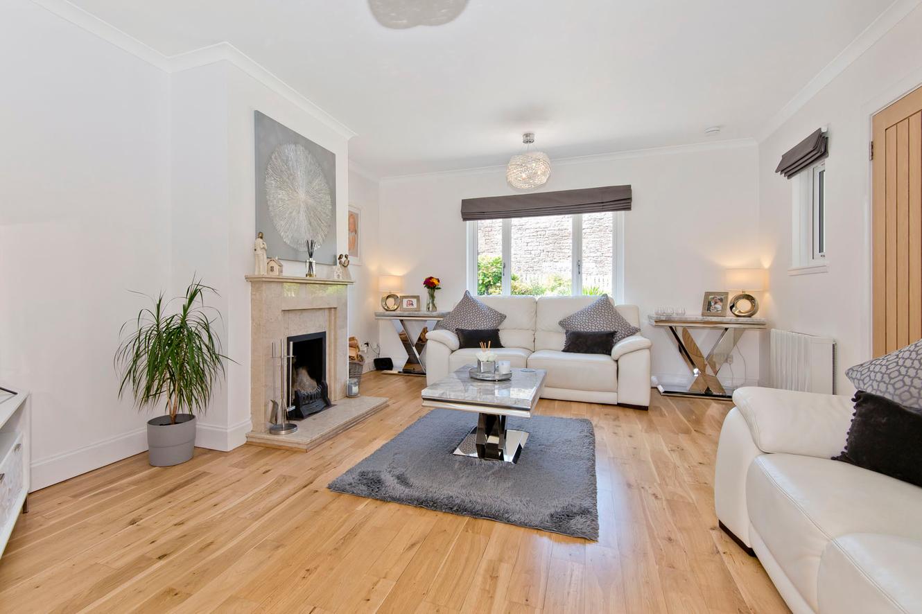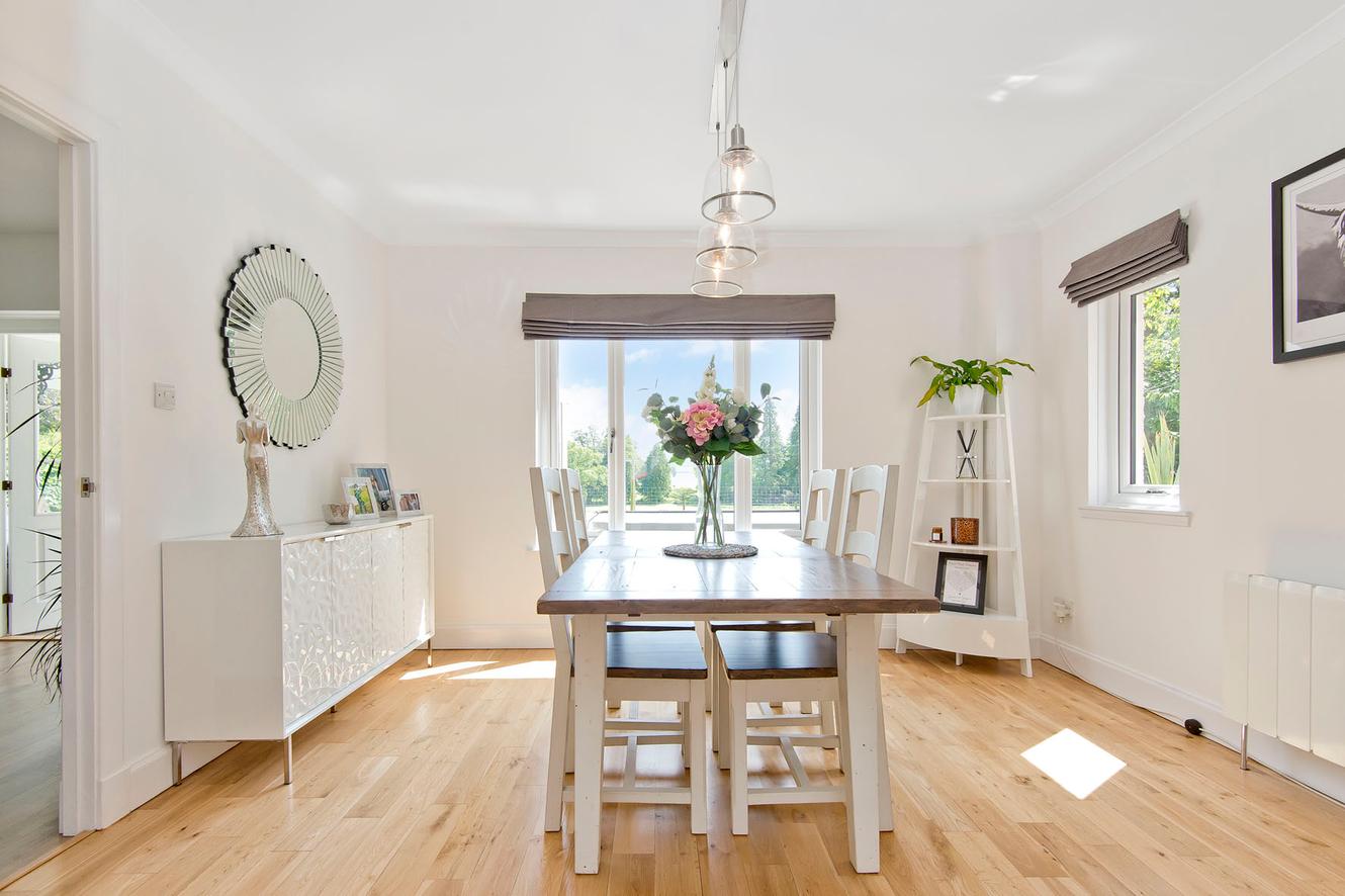 The living room and dining room enjoy a sociable open plan layout, perfect for everyday family life and entertaining alike and both continuing the attractive presentation of the entrance area with the same décor and oak flooring. The elegant living room offers plenty of space for lounge furniture configurations, all arranged around a homely marble fireplace with a fire inset. The adjoining dining room provides an ideal setting for family meals and dinner parties, with ample space for a large dining table and chairs. It is illuminated by a southwest-facing window flooding the room with sunny natural light throughout the day and framing views of the garden and the green space beyond. The third reception area, a sunroom, is connected to the kitchen via double doors, creating another sociable space in which to relax with family or entertain guests. It is filled with natural light through a wealth of glazing and features French doors opening onto a patio in the garden.