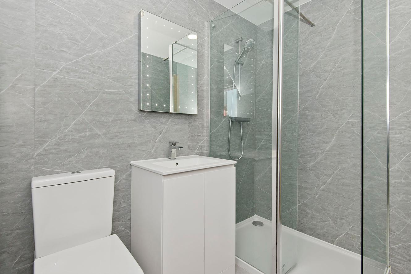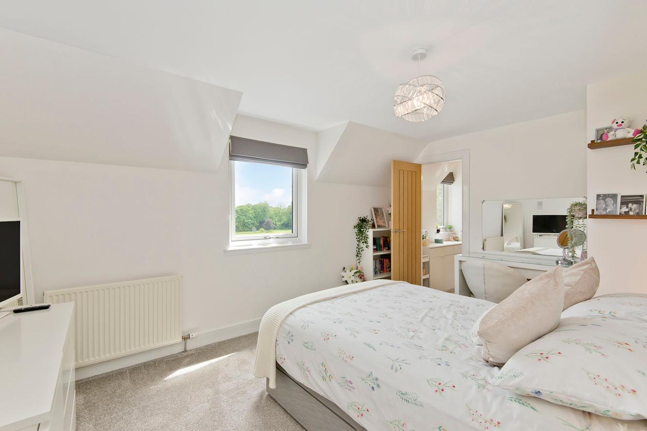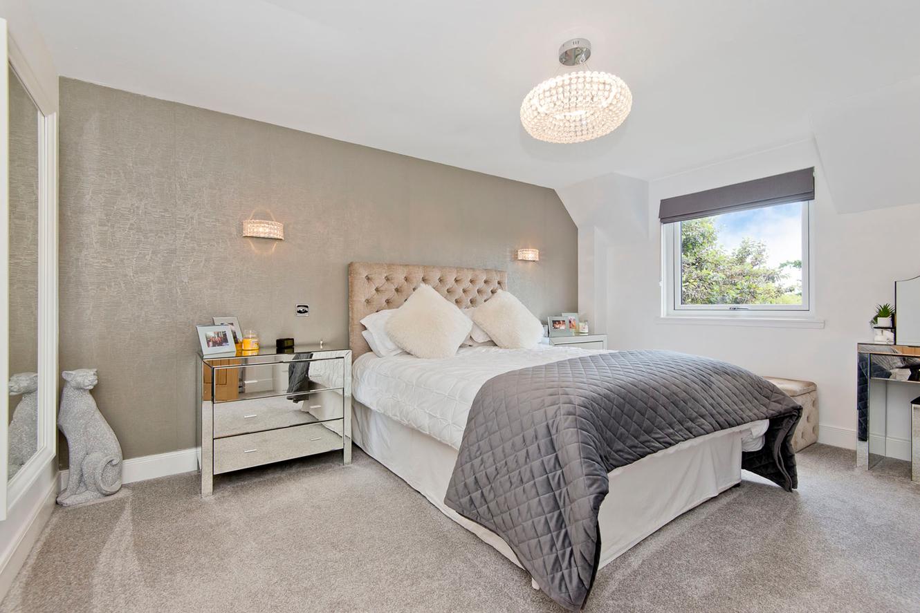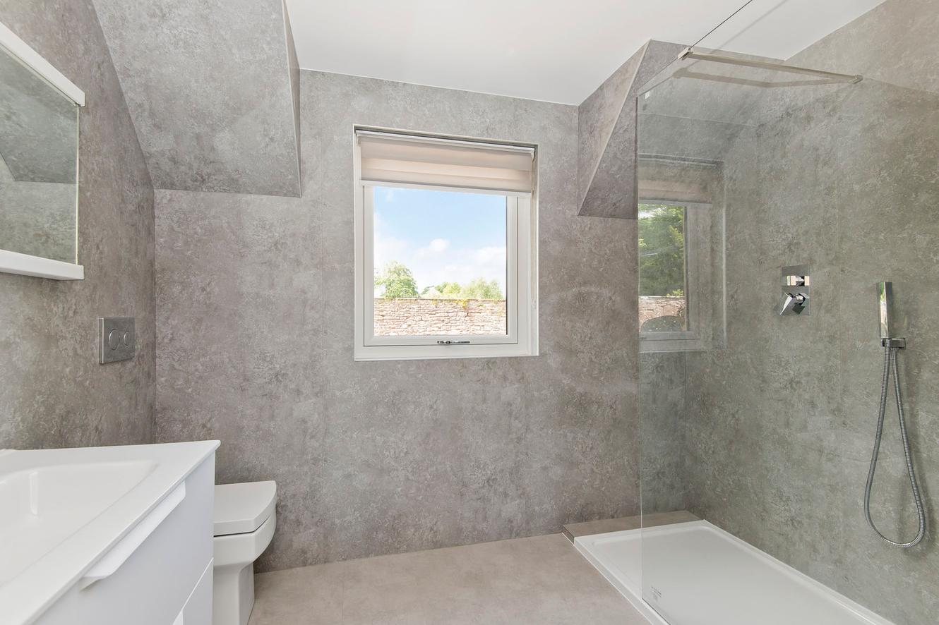 The en-suite shower rooms are similarly styled with chic grey aqua panelling, and the principal’s washroom comprises a deluxe walk-in shower enclosure with a rainfall showerhead and handset, a basin set into vanity storage, and a WC. The Jack-and-Jill shower room has a walk-in enclosure, a vanity unit with an inset basin, an illuminated mirror, and a WC.
