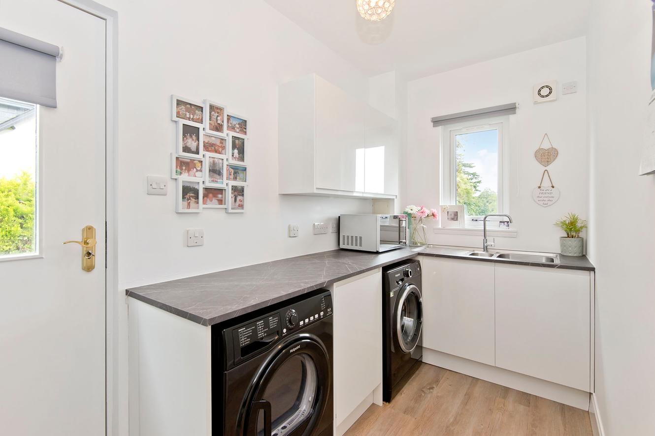 The kitchen comes very well-appointed with a wide range of contemporary, gloss-white wall and base cabinets, spacious worktops, and splashback panels, with integrated appliances comprising an oven, an induction hob, an extractor hood, a wine cooler, and a dishwasher. A breakfast bar caters for morning coffee, busy weekday breakfasts, and socialising while cooking, whilst an adjoining utility room (with external access) supplements the kitchen, with additional cabinetry, workspace, and space for laundry appliances.
