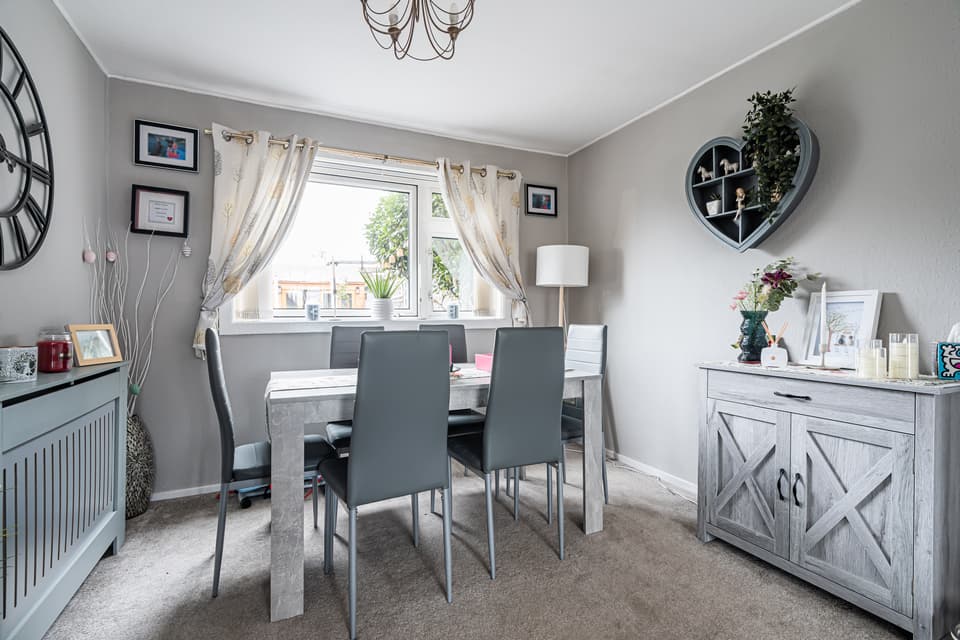 The ground floor accommodation comprises a small entrance hall leading into a spacious open-plan sitting and dining room, offering excellent flexibility for modern family living. To the rear, the kitchen provides good worktop and storage space and enjoys direct access to the rear garden—ideal for indoor/outdoor living during warmer months.