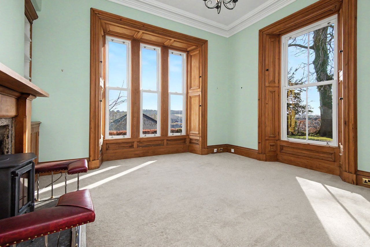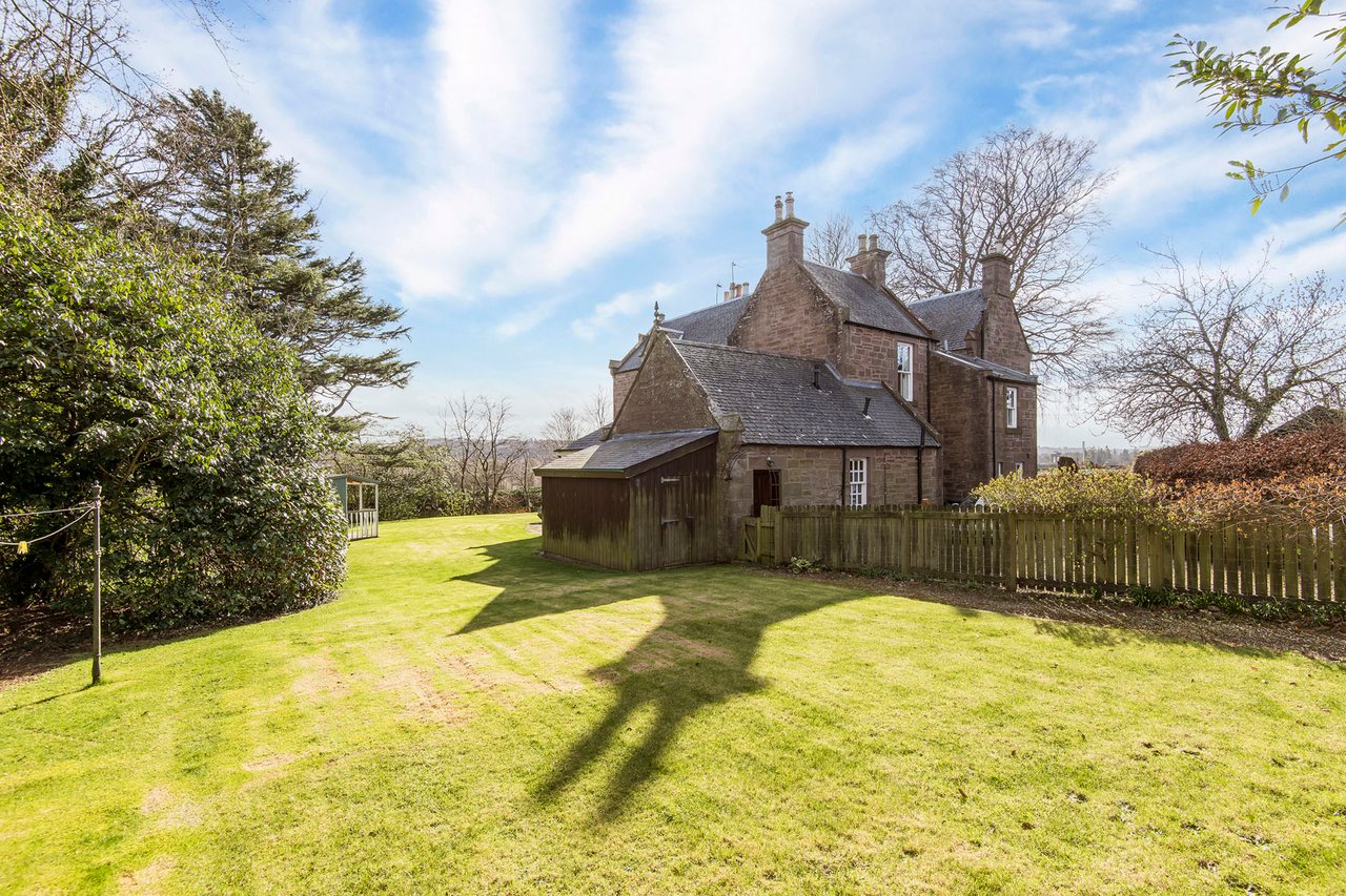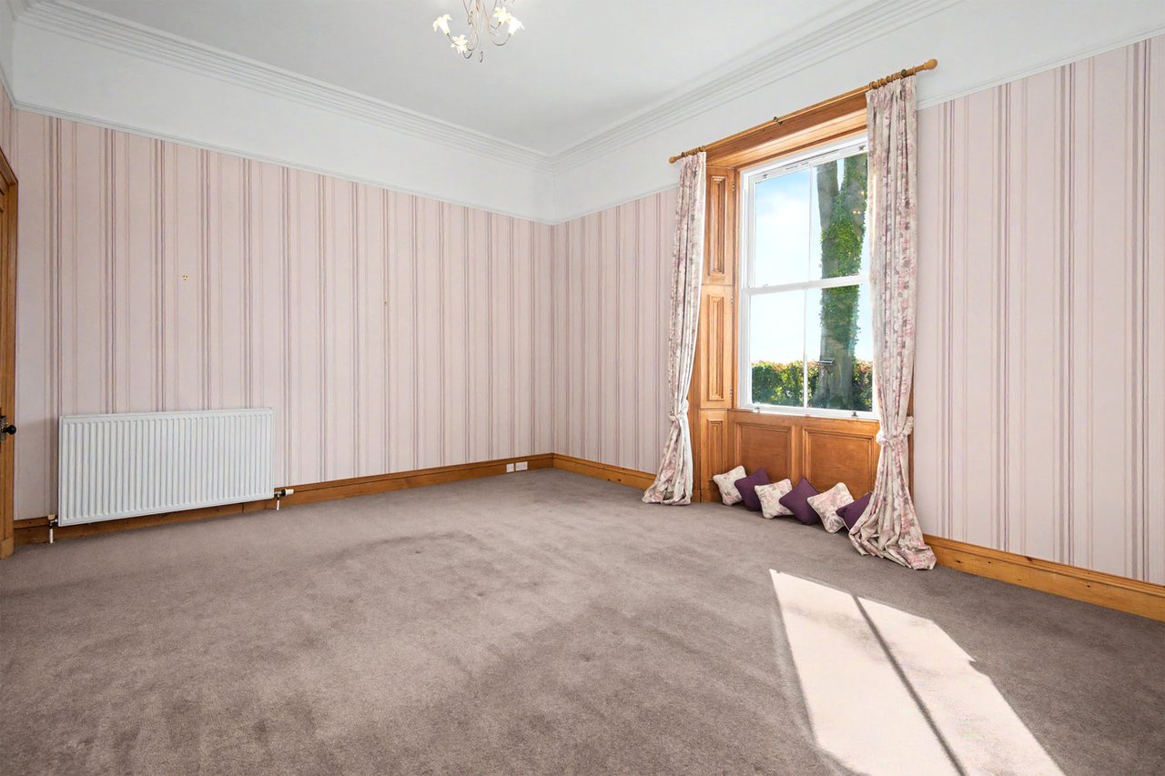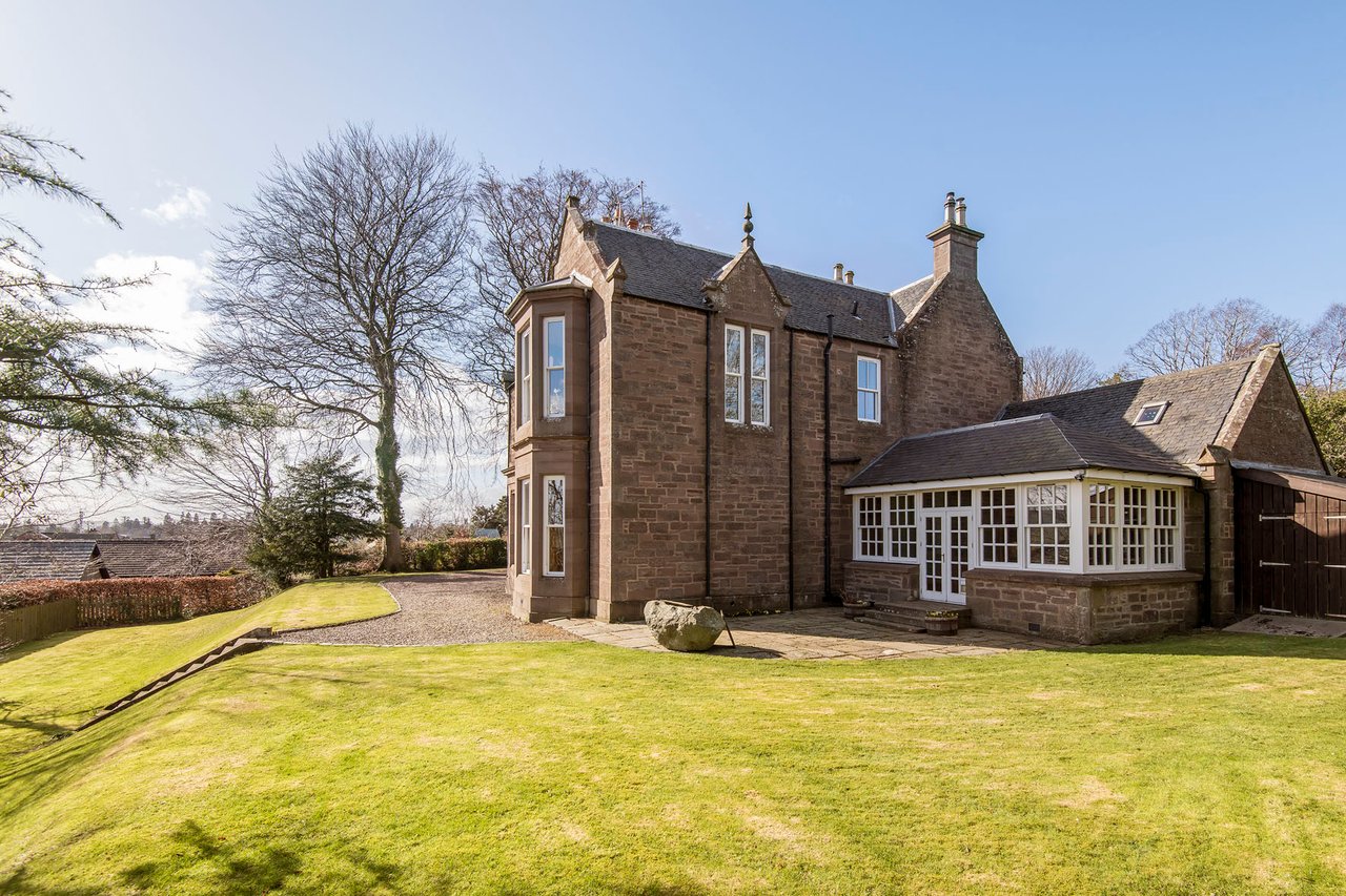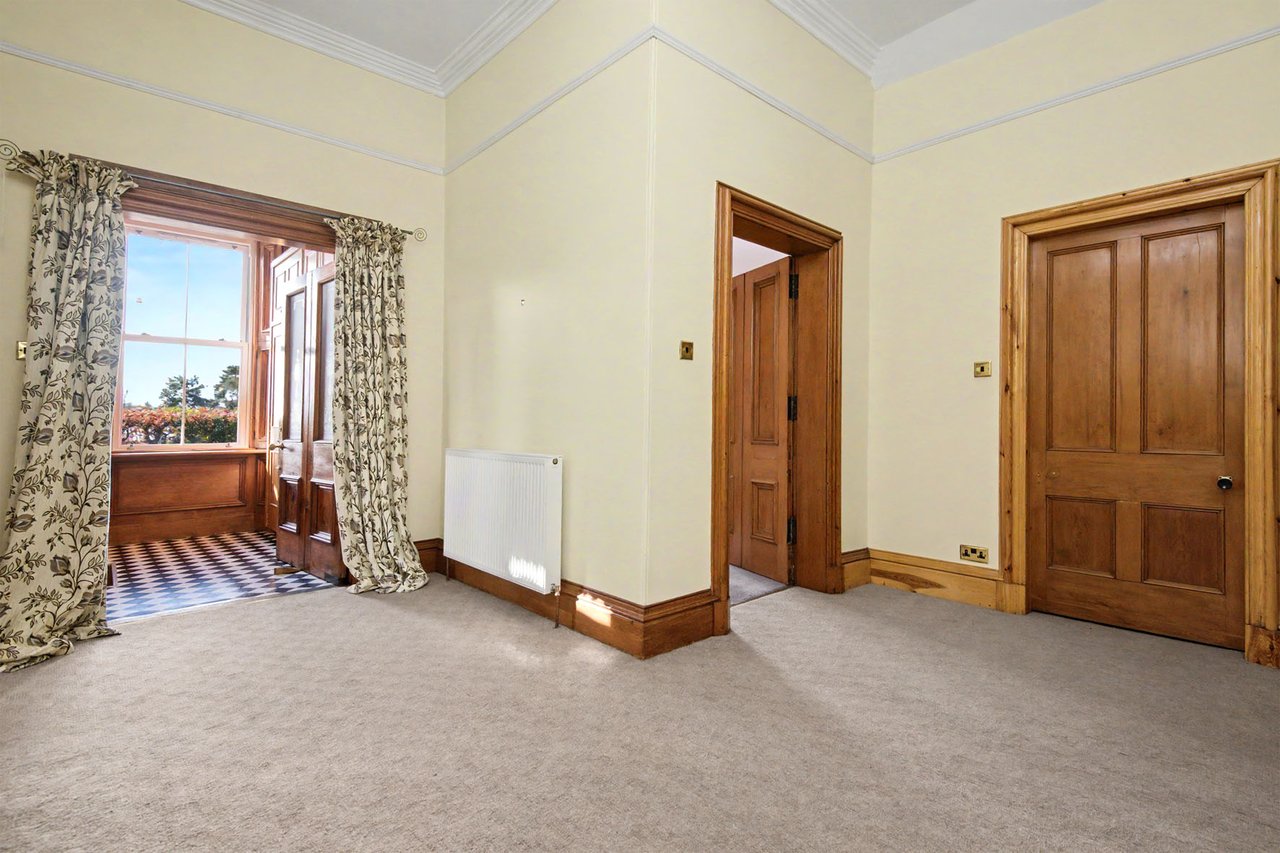 Quietly positioned on a leafy residential road in Brechin, this impressive ground-floor home combines period grandeur with generous proportions, versatile living space, and extensive private gardens. The three-bedroom home is likely to appeal to families, professionals, or those seeking character, privacy, and excellent outdoor space, all within easy reach of the town centre, schooling, and road links to Dundee and Aberdeen. Beautifully retained original details, including panelled doors, deep skirtings, working shutters, and high ceilings, are paired with sympathetic décor throughout. The property also enjoys a sunny south-facing aspect to many of its principal rooms, as well as substantial garden grounds and plentiful private parking. The home opens with an entrance vestibule and welcoming hall showcasing attractive timber panelling and a classic chequered floor. A spacious living room enjoys a handsome bay window, ornate cornicing, and an elegant marble fireplace with a gilt-framed mirror above, whilst the kitchen offers generous workspace and room for dining. Extending from the kitchen, a striking sun room provides a versatile additional reception and dining area, filled with natural light and opening directly onto the garden via French doors.