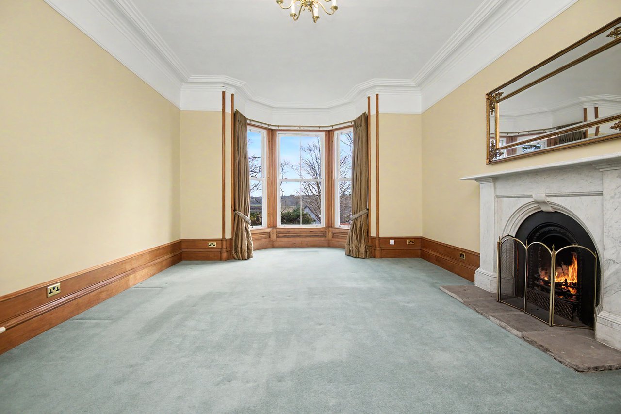 Spacious bay-fronted living room with an elegant fireplace