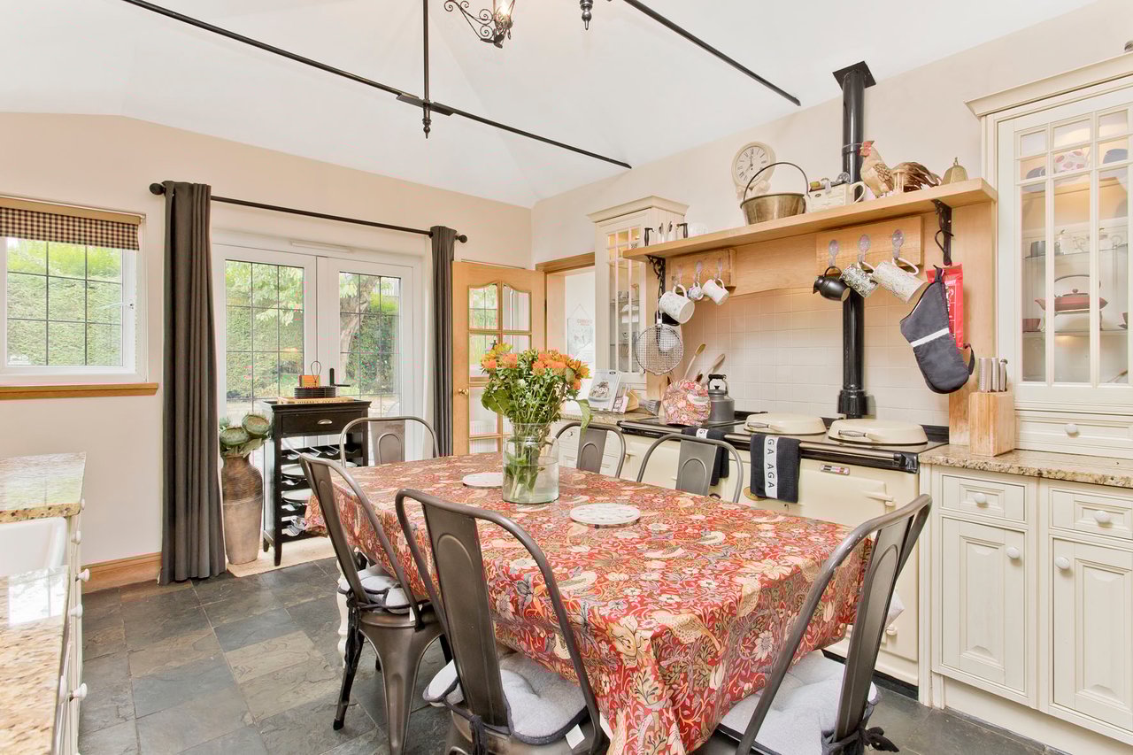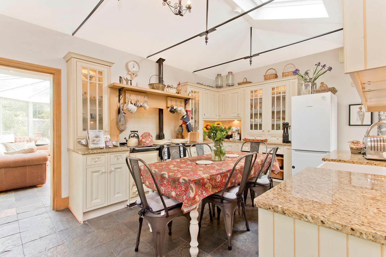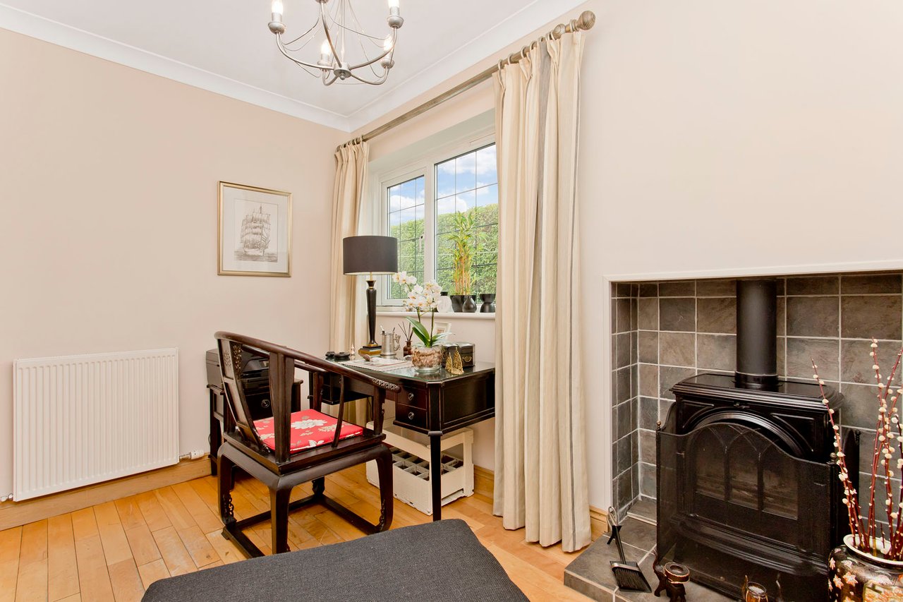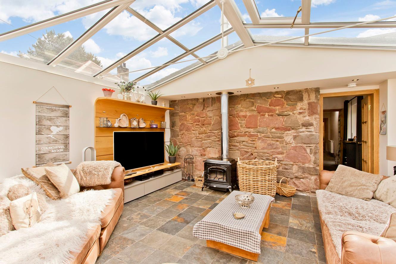 Offering a wonderfully flexible and spacious family home, with four bedrooms, multiple reception rooms, and three bathrooms, enhanced by tasteful décor and characterful features, this generous detached house is situated in Broughty Ferry, close to all the town has to offer. The house is accompanied by a terrace, spacious, mature gardens (with a charming cabin), and a multi-car driveway. The house is set back from the road behind a wall and a gated driveway, offering sought-after privacy, and the front door opens into an entrance porch, flowing through to a long hall with built-in under-stair storage. Neutral décor and a rustic tiled floor set the tone for the tasteful interiors to follow. Leading off the hall are the first two reception rooms, set up in a desirable open-plan layout and comprising a living room and a garden/dining room, both presented with neutral décor and coordinating fitted carpeting. The living room features a striking fireplace around which furniture can be arranged, flanked by a southwest-facing window. The adjoining garden/dining room is filled with natural light through a wealth of glazing, including large patio doors which extend the space outside onto the garden. The room offers plenty of space for arrangements of furniture and could be used in a number of different ways. At the opposite end of the hall, a kitchen (with garden access) awaits and provides space for a central seated dining area, ideal for casual meals and morning coffee. A range of timelessly classic cream-coloured cabinets are accompanied by granite worktops, a Belfast sink, and neutral splashback tiling, as well as appliances including a beautiful cream Aga stove and a freestanding fridge/freezer. A large neighbouring utility room (also with external access) is fitted with matching cabinetry and worktops, a double Belfast sink, and a breakfast bar, and houses additional appliances. The final reception area, a particularly spacious, light-filled conservatory, enjoys a characterful exposed stone feature wall and a warming Aga multi- fuel stove. A shower room and a study complete the ground-floor accommodation, with the latter providing a quiet space for working or studying from home and featuring another multi-fuel stove. On the first floor, a landing (with storage) leads to three of the home's four double bedrooms on offer, and a bathroom. The bedrooms are all presented with pared-back, tasteful décor and fitted carpets for optimum comfort underfoot. The principal bedroom is supplemented by a built-in wardrobe and a modern en-suite shower room comprising a shower enclosure and a WC-suite, whilst the second largest sleeping area affords access to a large southeast-facing terrace overlooking the leafy gardens and providing ample room for outdoor seating. The family bathroom comes complete with a freestanding rolltop bathtub with a traditionally styled shower attachment, and a WC-suite, enveloped by stylish monochrome wall and floor tiling. The fourth and final bedroom is situated on the second floor and benefits from a wealth of built-in storage, as well as access to the eaves storage. The home is kept warm by a gas central heating system and the windows are all double-glazed, with the exception of the porch. Externally, the house is complemented by spacious, mature garden grounds featuring large, well-maintained lawns, a wealth of lovely leafy trees, shrubs, and hedges, a patio for outdoor seating, and a secluded corner with a charming cabin and space for a hot tub. A number of sheds, Wendy houses, and further outdoor storage solutions are also included. The private front driveway offers ample off-street parking. Extras: all fitted floor coverings, window blinds, most curtains, all light fittings, all white goods, and most of the furniture from the garden cabin will be included in the sale. Other items of furniture may also be available as part of the sale.