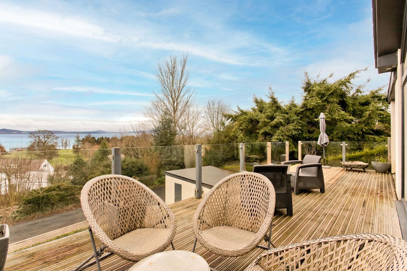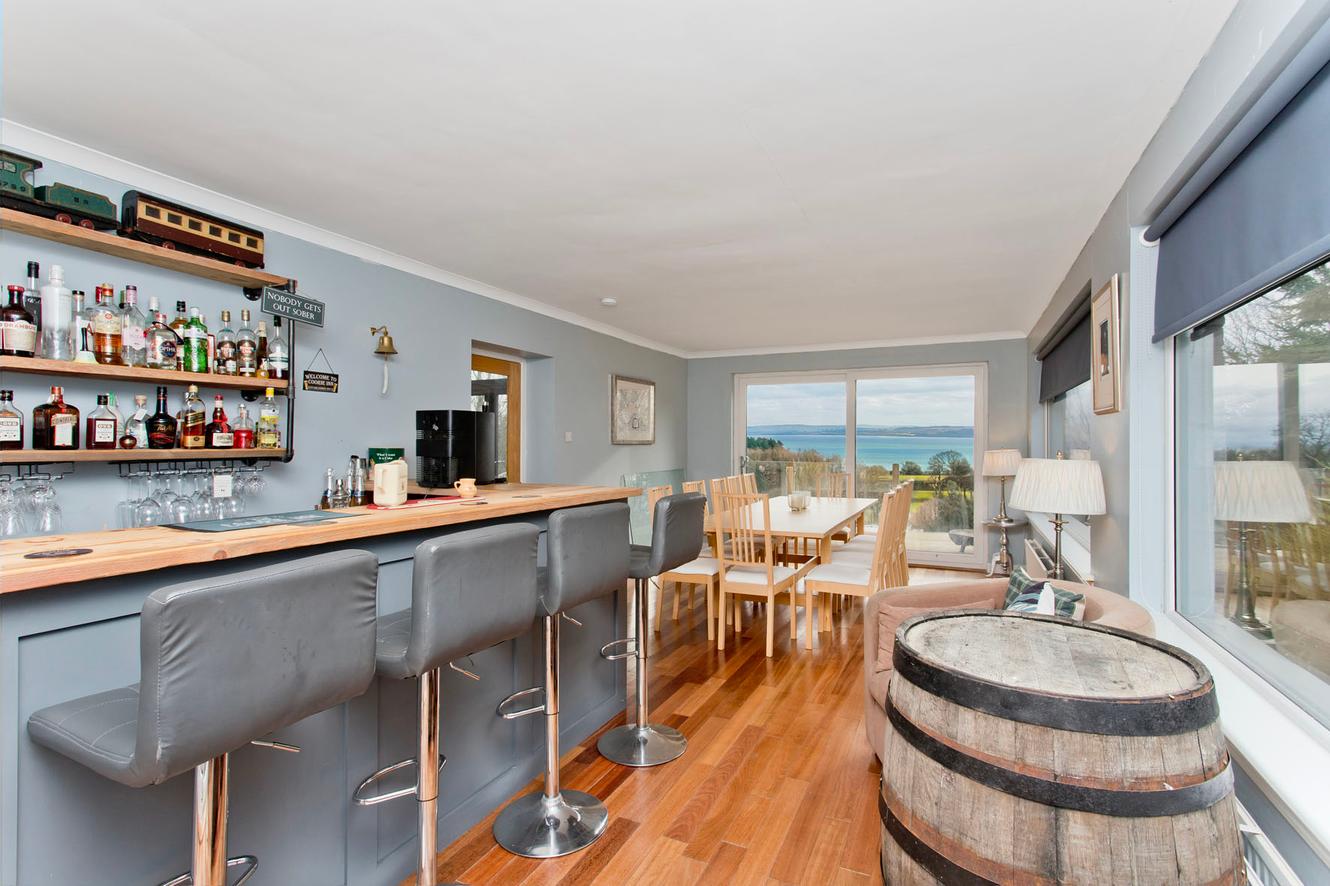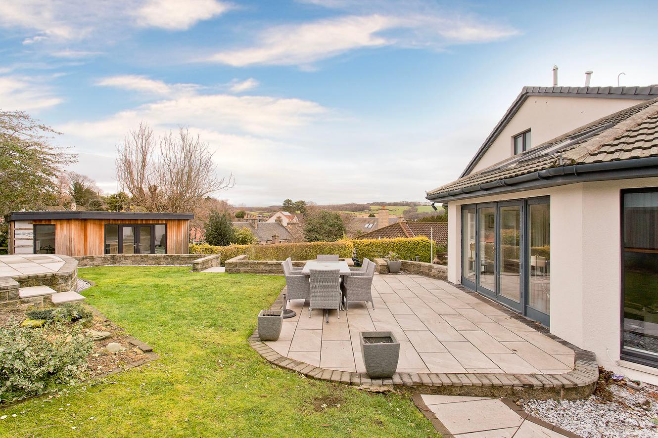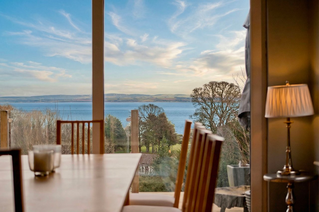 Situated in the historic coastal village of Aberdour, with incredible elevated views, this striking detached residence is an exceptional family home. It promises all the space and functionality required for modern living, with five bedrooms (two with en-suite shower rooms), a four-piece bathroom and third shower room, and a utility room. Interconnected sun-filled reception areas, including a sitting room, a dining room with a bar, and an open-plan breakfasting kitchen/living room, all flow onto the landscaped gardens, which include a raised south-facing terrace and a powered garden room. The partially enclosed wraparound plot also provides garage and private driveway parking.
