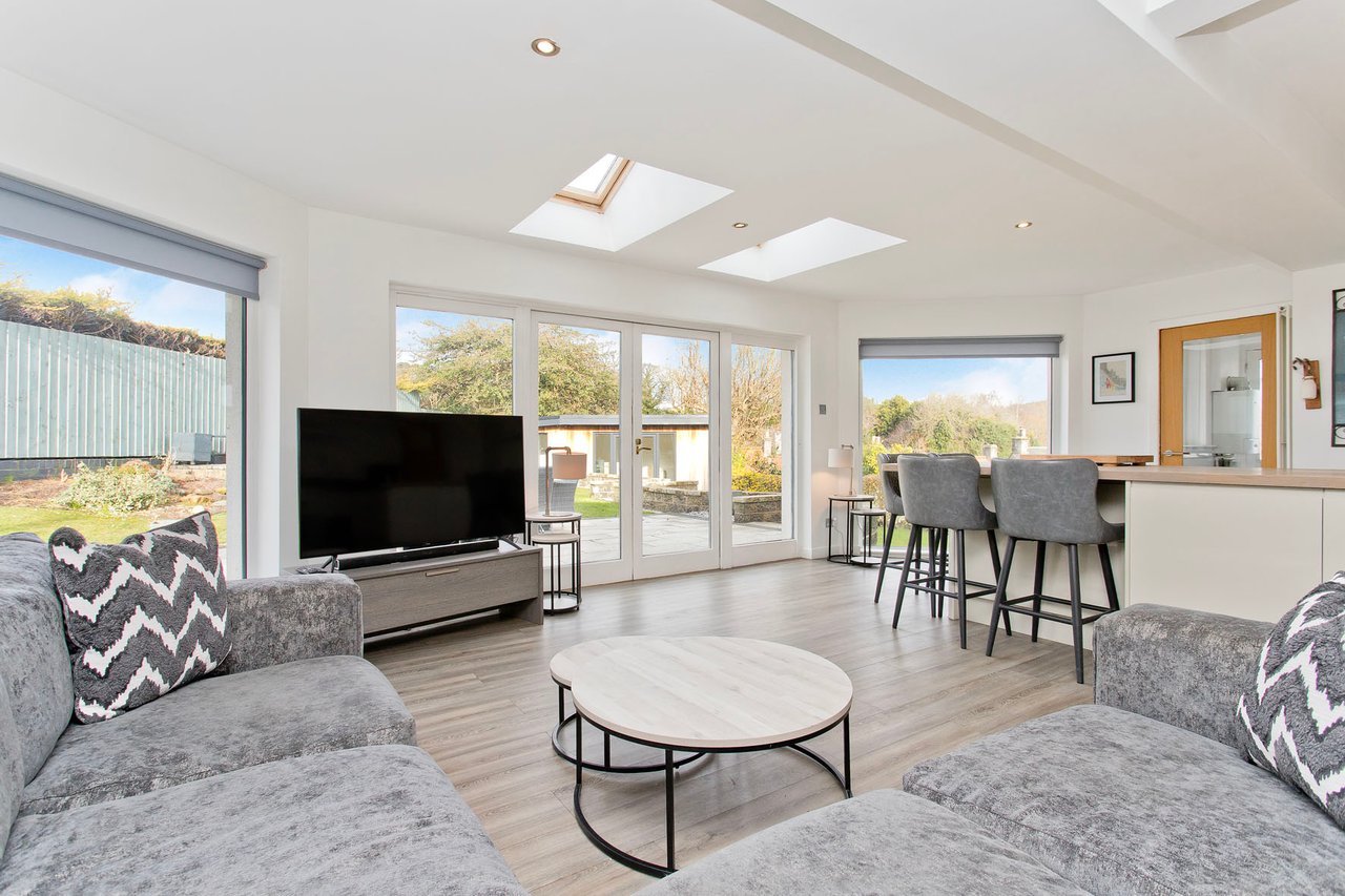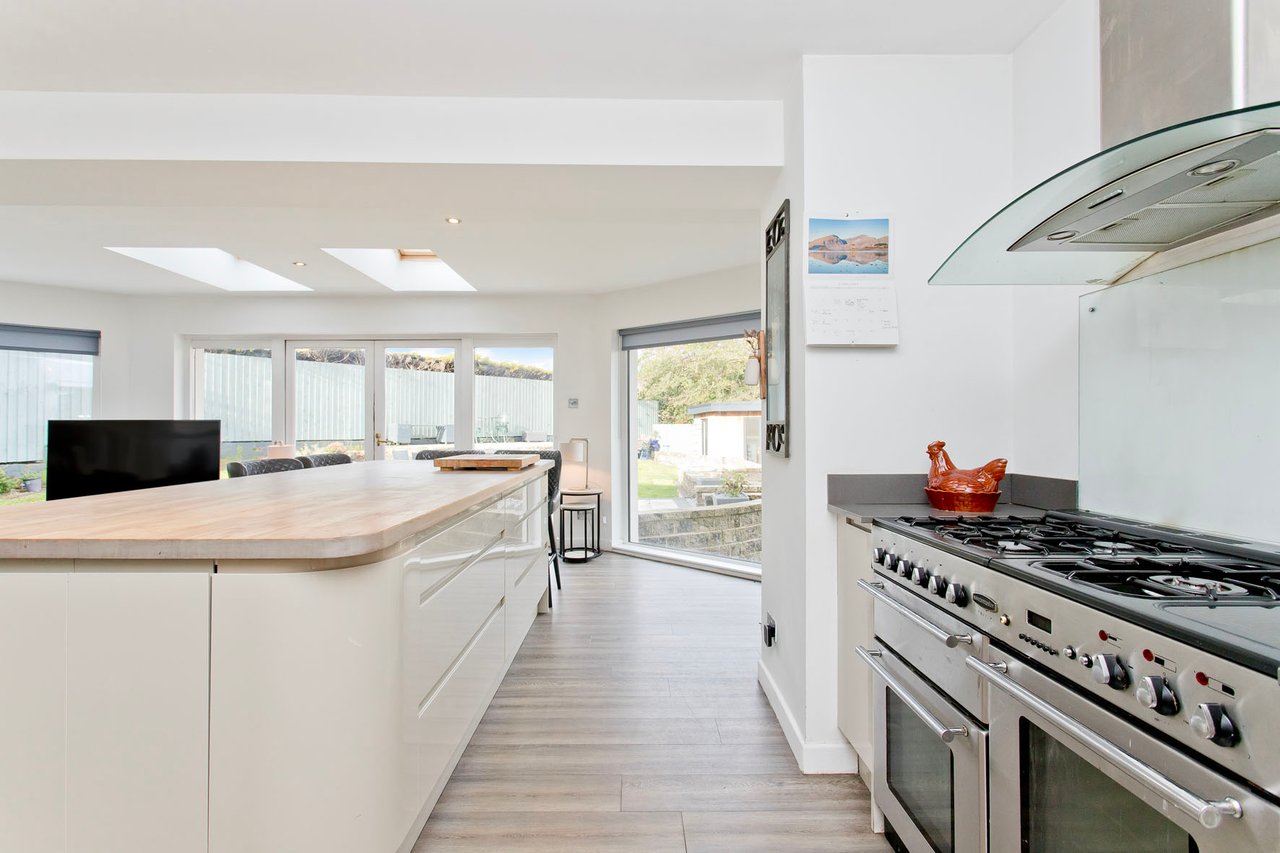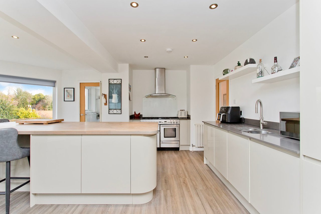 Open-plan breakfasting kitchen and living room. The kitchen is perfectly suited to relaxed family time, featuring garden access, a breakfast island, and a versatile living area, enhanced by full-length windows and roof lights that flood the room with natural light. Designed in classic ivory white and wood tones, the kitchen boasts sleek curved cabinetry with an integrated dishwasher, space for a standalone fridge freezer, and a stainless-steel range cooker with a chimney-style hood forming a timeless focal point. An adjoining plumbed utility room provides a discreet laundry area with outdoor access.