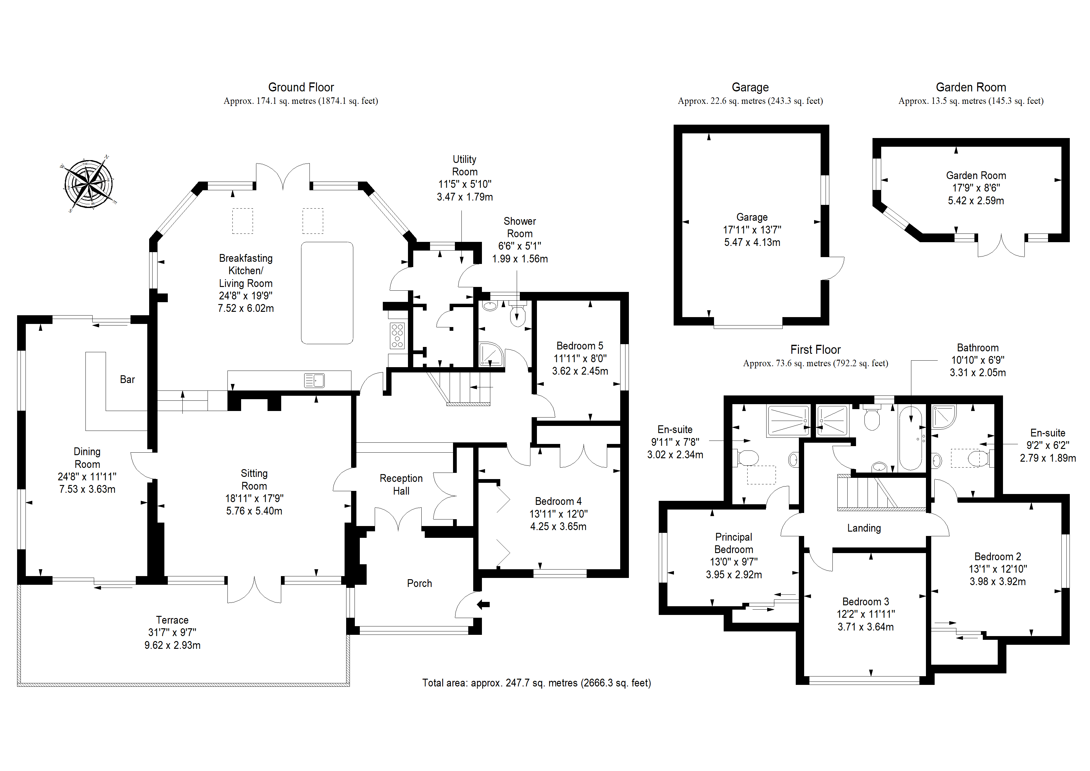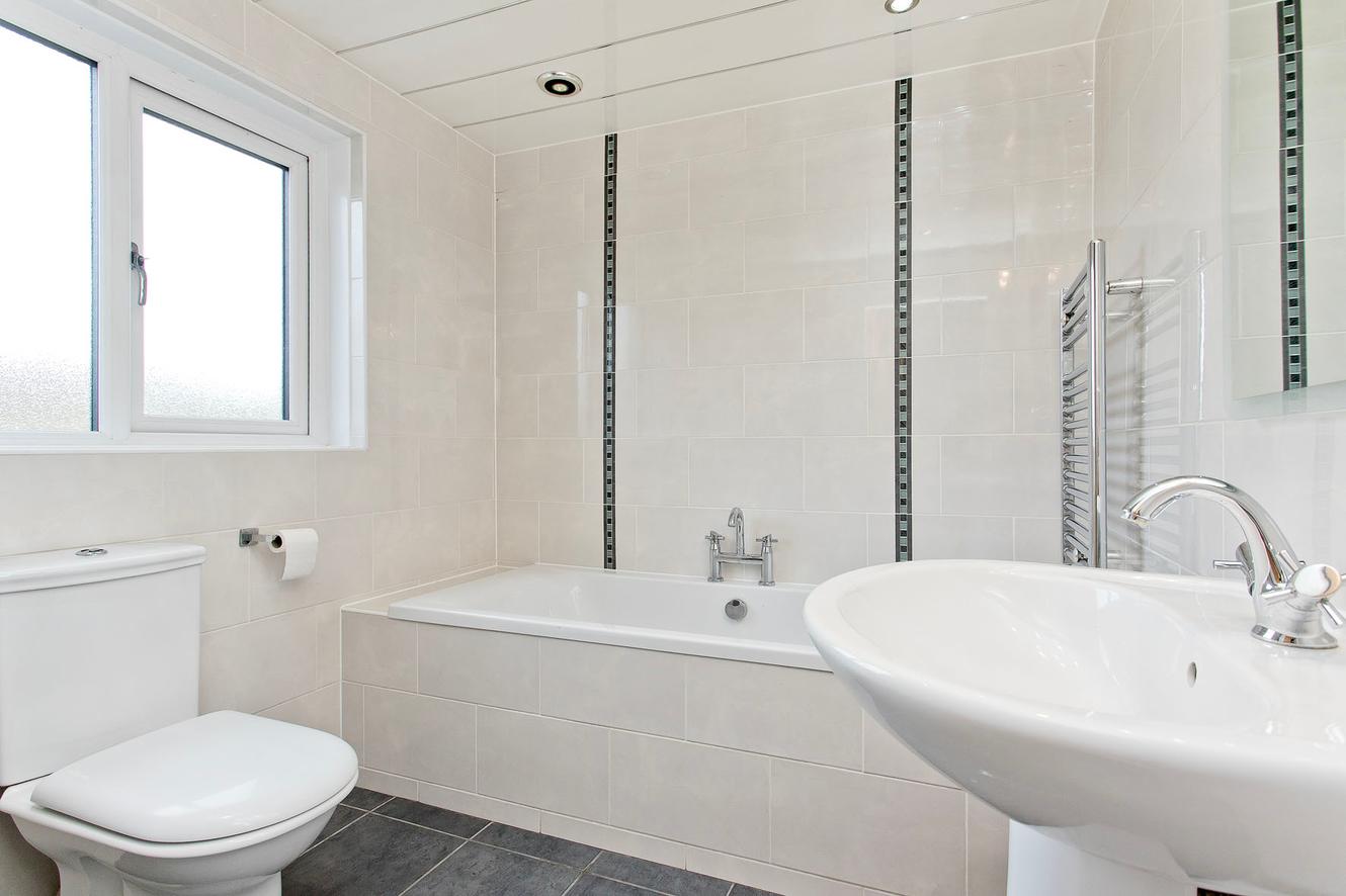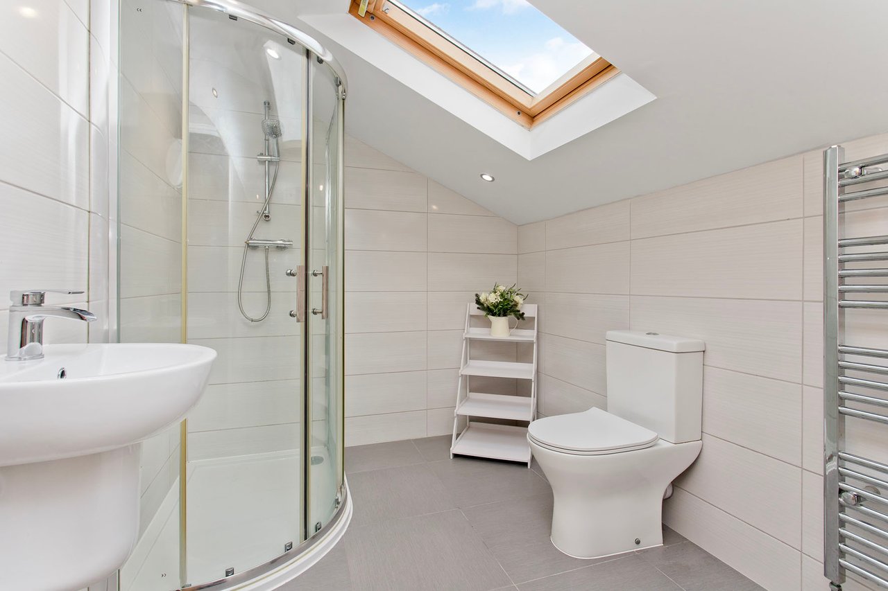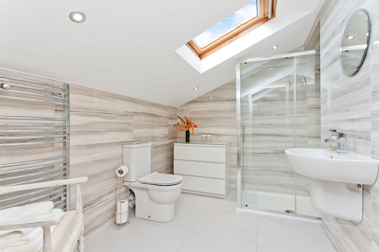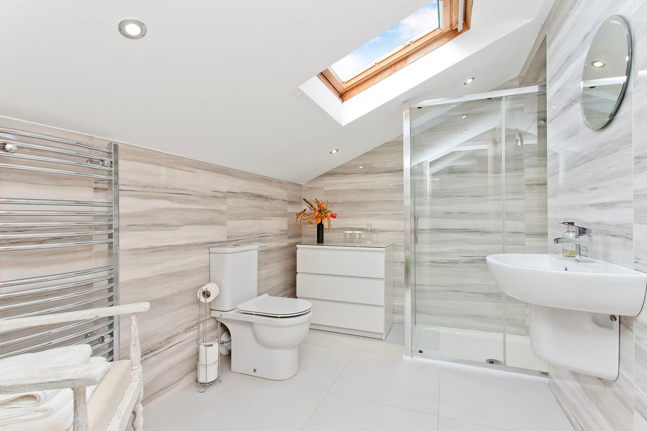 Further bath and shower facilities . A second double bedroom enjoys the convenience of an en-suite shower room, whilst a first-floor bathroom with a bath and separate shower, and a ground-floor shower room, provide excellent facilities for family and guests. Each washroom is chicly tiled and benefits from natural light.