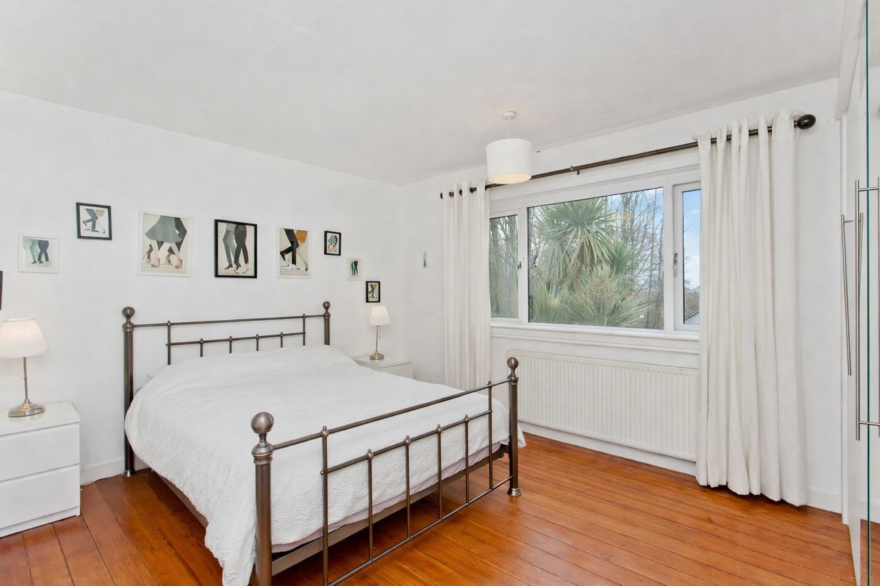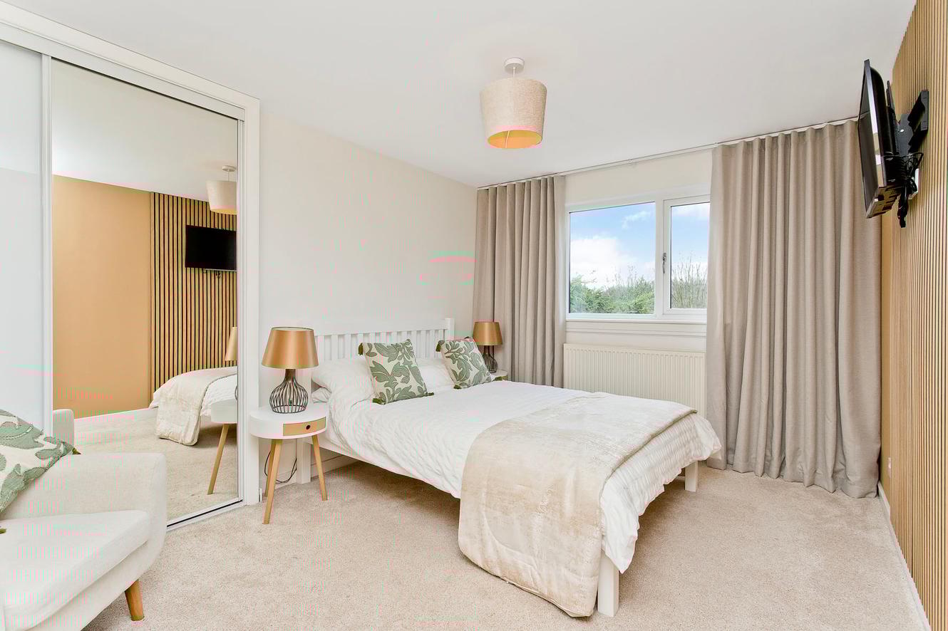 Relaxing principal suite. The principal suite provides a private retreat on the first floor, complete with mirrored fitted wardrobes and a stylish sky-lit shower room. The bright and airy bedroom is subtly accented by soft carpeting and timber wall slat detailing.