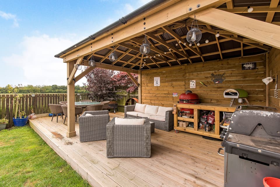 Private rear garden with shed, covered deck