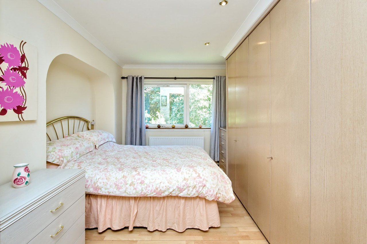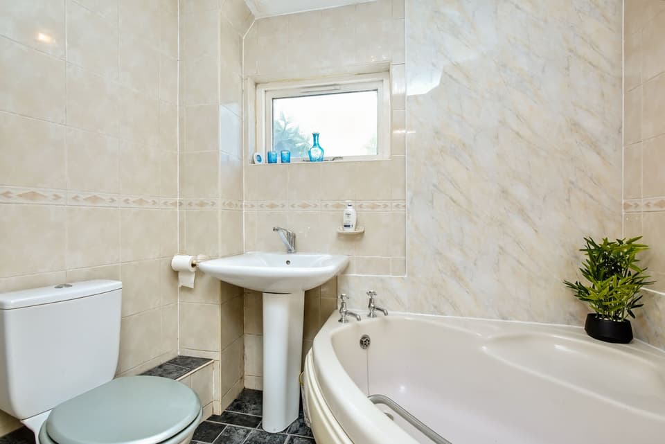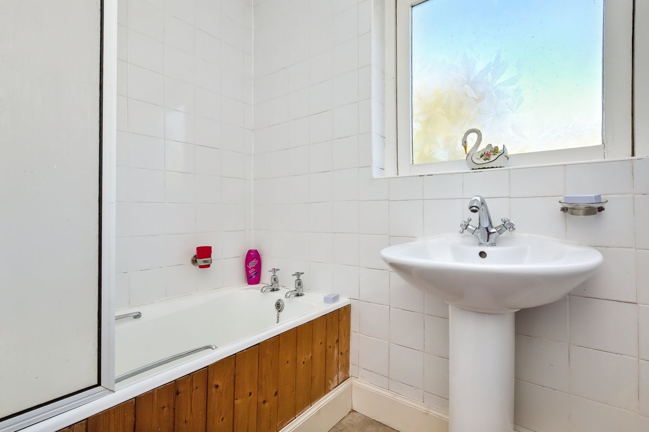 The front door opens into a hallway with built-in storage, flowing through a living room: a generous reception room enjoying morning sun through east- facing glazing, including patio doors opening onto the garden. The room offers plenty of space for furniture and is adjoined by a WC, as well as being connected to both the dining room and the conservatory. The latter provides a versatile living area with a door onto the garden, whilst the former represents an ideal space for family meals and entertaining, with convenient direct access to the kitchen.