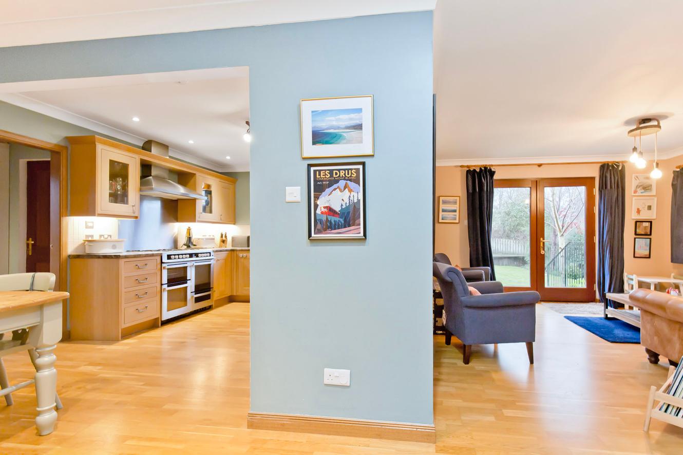 This spacious detached four-bedroom family home in the desirable market town of Crieff sits proudly on a wraparound plot enjoying neatly kept gardens, tranquil leafy vistas, and a large gated driveway, in addition to an integral garage. Presented in tasteful Farrow and Ball tones, the high-quality modern interiors promise superb comfort and functionality with multiple versatile reception spaces including a dining/family room open-plan to the kitchen. Furthermore, there is a shower room in the principal suite, a family bathroom, a guest WC, plentiful incorporated storage, and a utility room.