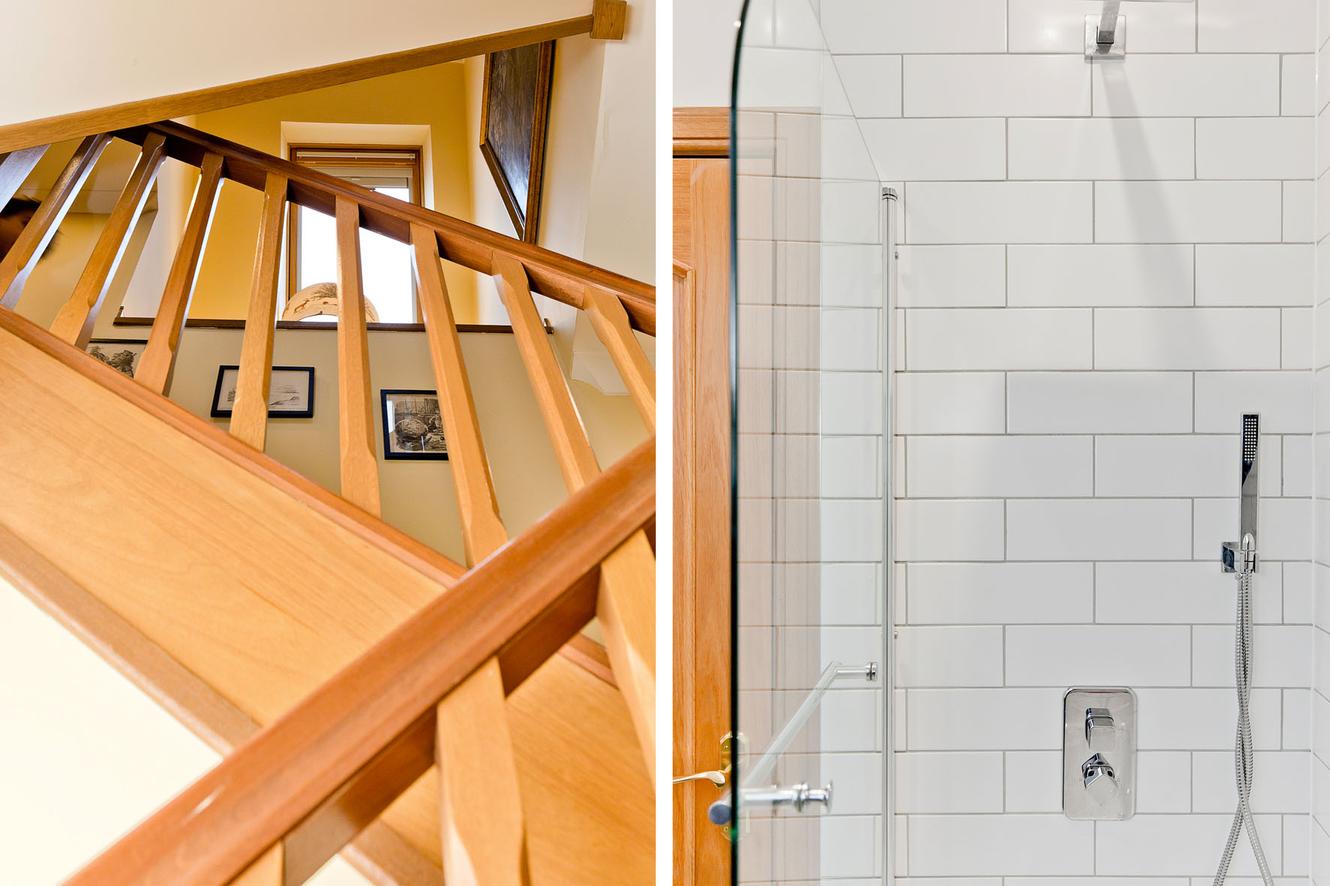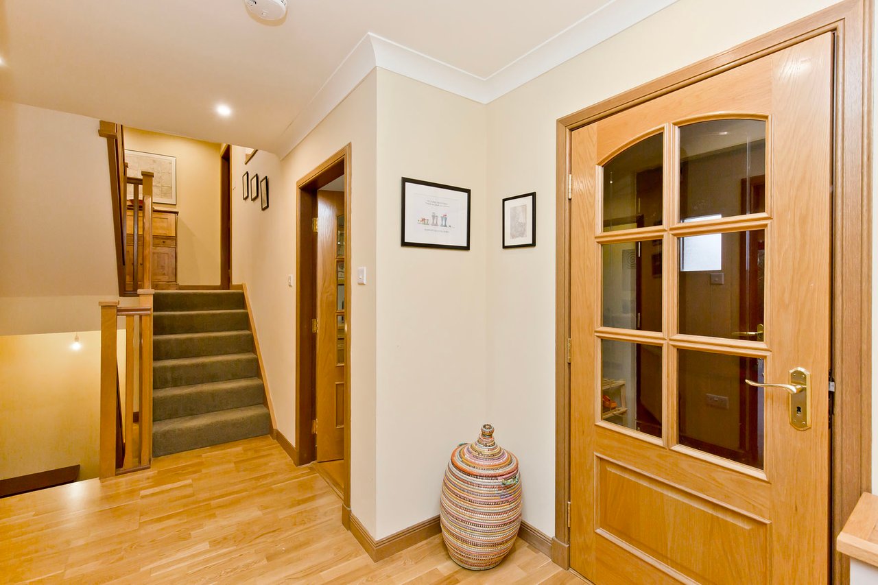 Welcoming entrance hall. A practical vestibule opens into the entrance hall, where neutral décor is warmly enhanced by engineered hardwood flooring and an oak staircase with new carpeting, immediately showcasing the home’s top-quality finish and contemporary styling.