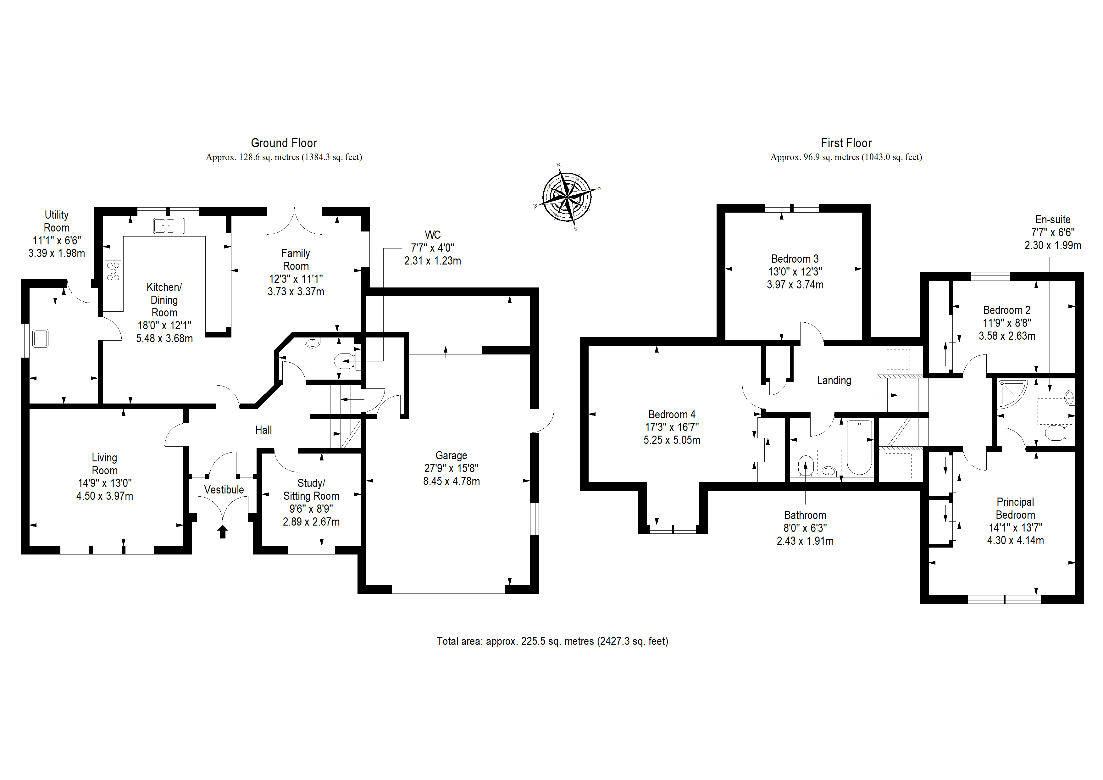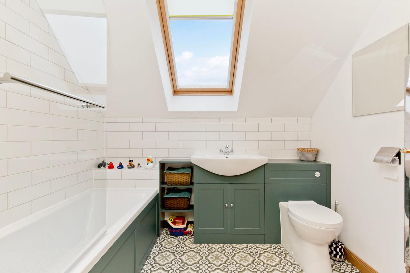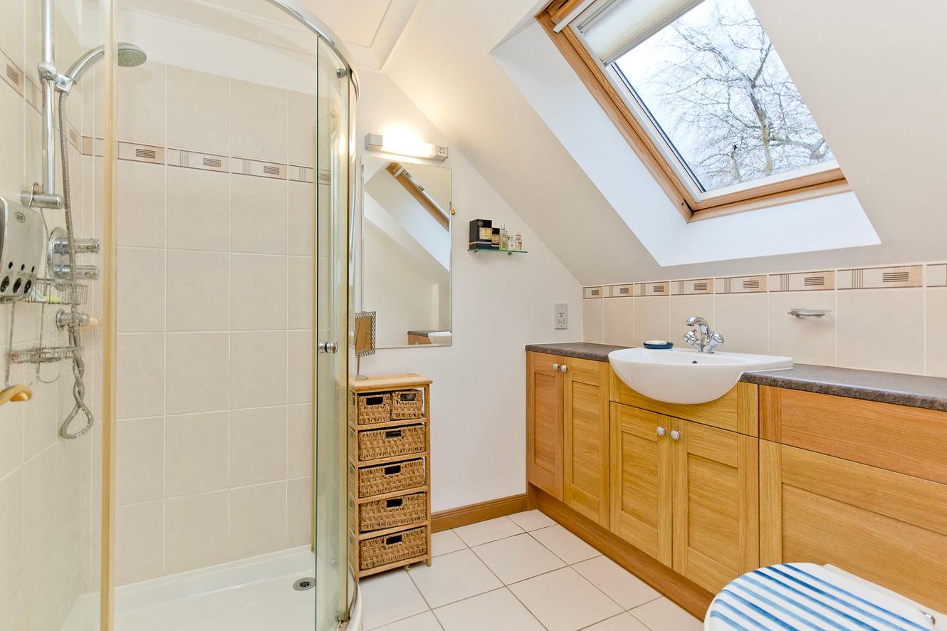 Family bathroom and guest WC In addition to the principal en-suite shower room, there is a first-floor newly appointed family bathroom and a ground-floor WC conveniently located off the hall. The light-filled bathroom features a rainfall shower-over-bath and vanity storage, combining contemporary fittings with a subtle period-inspired aesthetic.