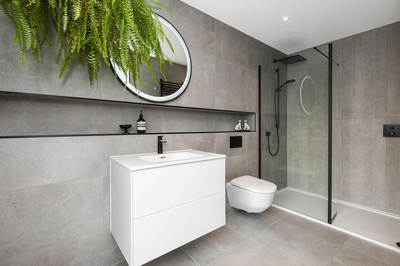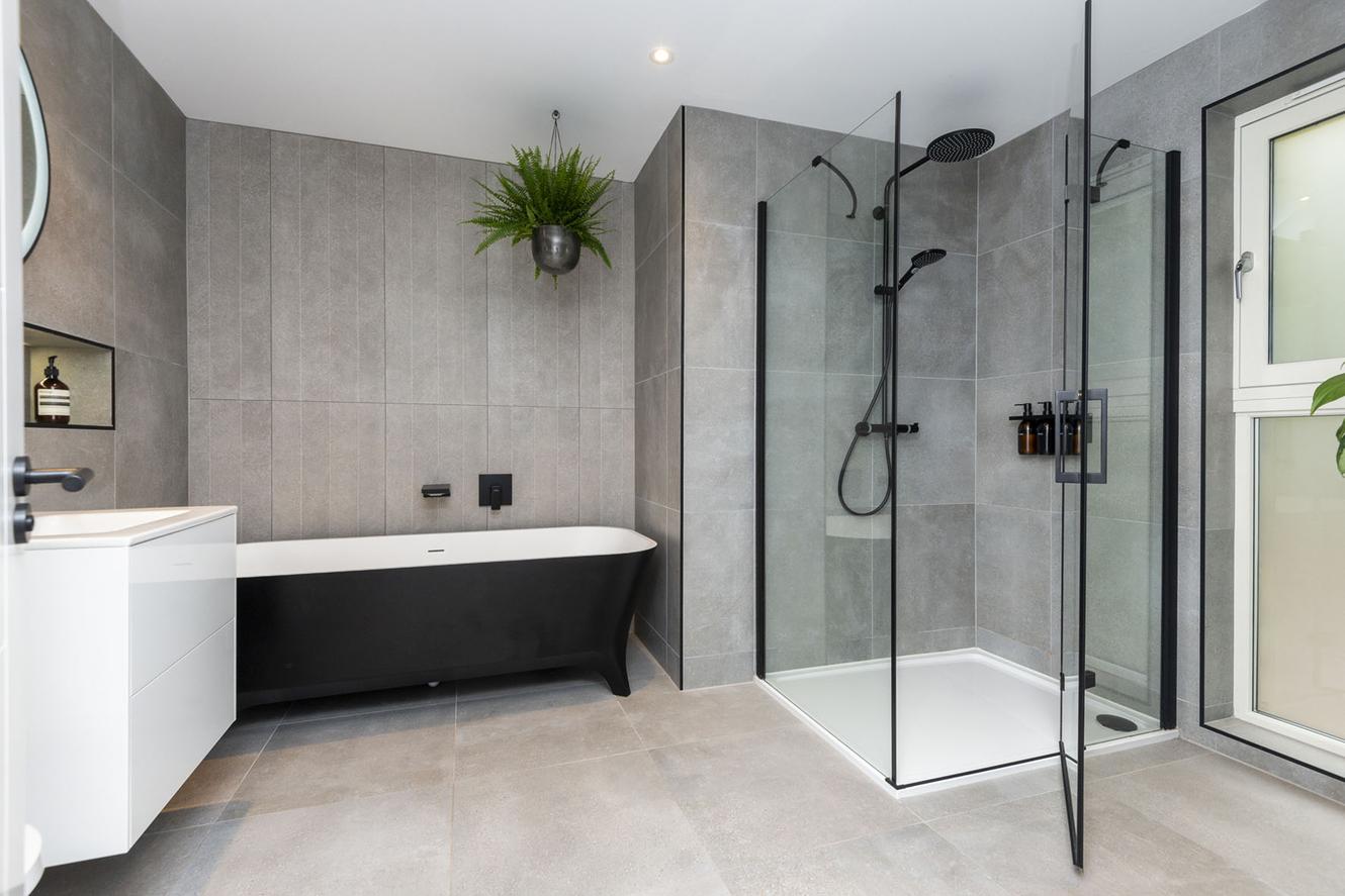Ukaipo has a ground-floor WC, the two en-suite shower rooms, and a first-floor family bathroom, all of which have matching high-specification designs. Adorned with Porcelanosa tile work and clever recessed wall storage, they maintain design continuity, incorporating sanitaryware by Laufen, taps and showerheads by Hansgrohe, and Merlyn shower screens. The four-piece family bathroom firmly sets the standards which the others follow, with its floating storage-set washbasin, concealed-cistern toilet, double walk-in rainfall shower enclosure, and freestanding (solid surface) mineral stone bathtub by Riluxa.