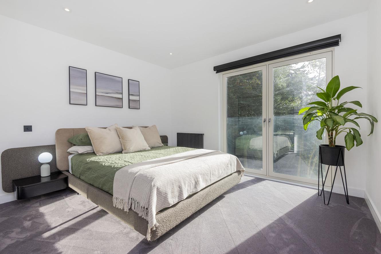 Connected to a naturally-lit galleried landing (with a glass-framed staircase), the home’s four bedrooms are all wonderfully large doubles that maintain the sharp eye for contemporary aesthetics. Each room features soft deep-pile carpeting and built-in mirrored wardrobes, ensuring optimal comfort and convenience. Furthermore, every room is fronted by southeast-facing glazed doors that open out to a Juliet balcony, allowing a flood of light inside whilst framing panoramic hillside views. Continuing the home’s luxury appeal, the principal and second bedrooms both have their own opulent en-suite shower room too.