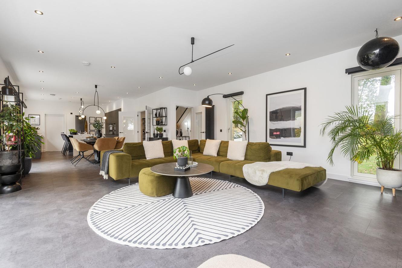 Organised around a central island with a breakfast bar, the German kitchen has a statement design by Pronorm. It features a generous selection of contemporary cabinets, paired with stylish Dekton worktops to offer all the space and storage a family could need. Thanks to the breakfast bar, it also forms a sociable centrepiece for conversing whilst cooking. Adding to the designer appeal, the kitchen is fitted with Franke sinks and a range of high-end integrated appliances, ensuring a smooth finish. Appliances include: Bora induction hob with built-in extractor, Siemens twin eye-level ovens with a warming drawer, Siemens tall fridge, Siemens tall freezer, and Siemens dishwasher. A neighbouring utility room also provides a quiet space for laundry.
