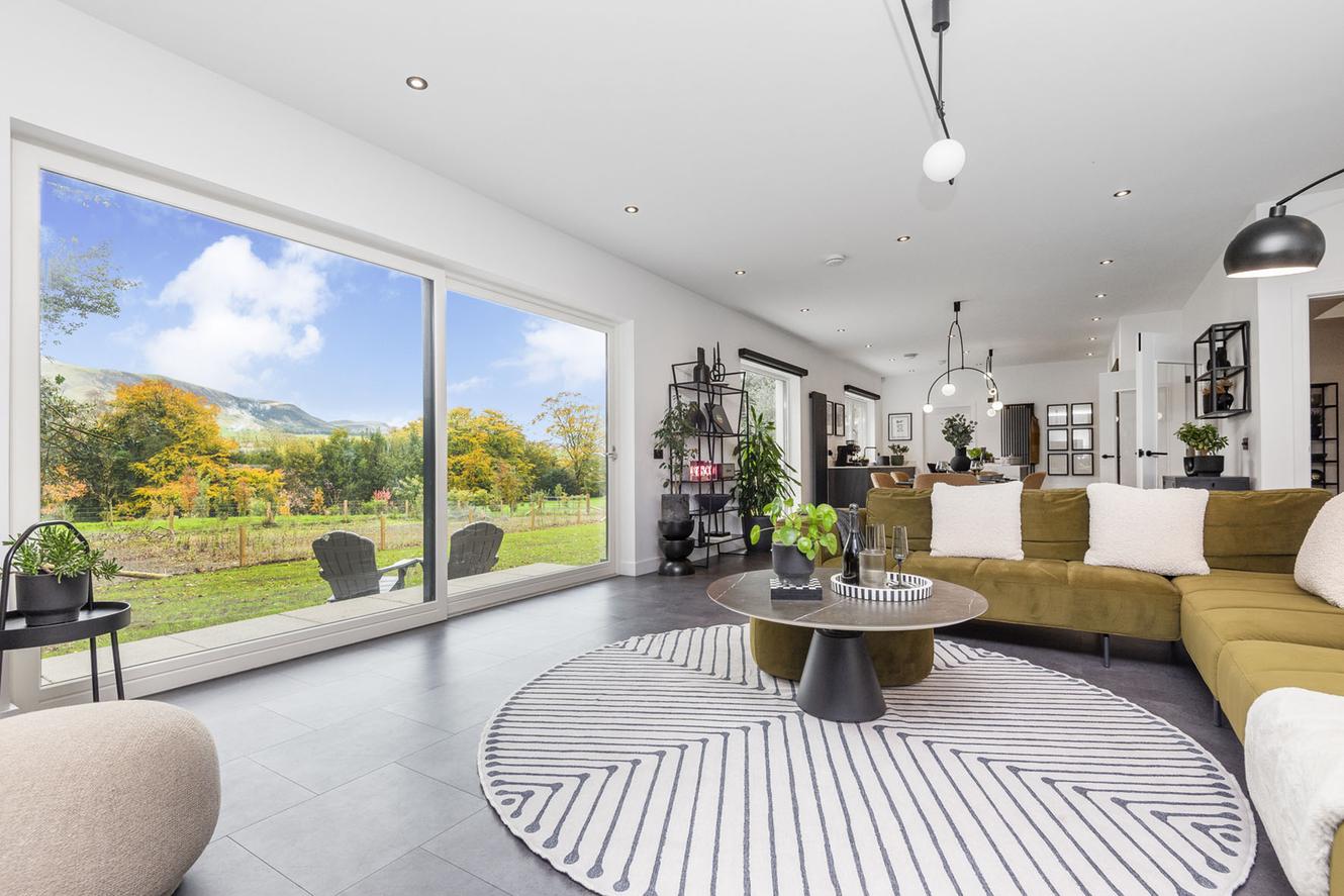 The home’s sprawling open-plan reception area covers the majority of the ground floor, combining a living and dining space with a high-specification breakfasting kitchen. It offers a substantial amount of room for a wide variety of lounge furnishings, as well as a large table and chairs creating the perfect setup for every occasion. Decorated in crisp white and with Karndean LVT flooring (like the hall), it enjoys a sophisticated aesthetic, worthy of the finest home interior magazines. A stylish media wall adds another touch of elegance. In addition, this extraordinary space has oversized dual-aspect windows to the southeast and northwest, capturing all-day sun and the picturesque backdrop of the rolling Lomond Hills. Glazed sliding doors also extend the room out into the garden, allowing a seamless transition to outside.