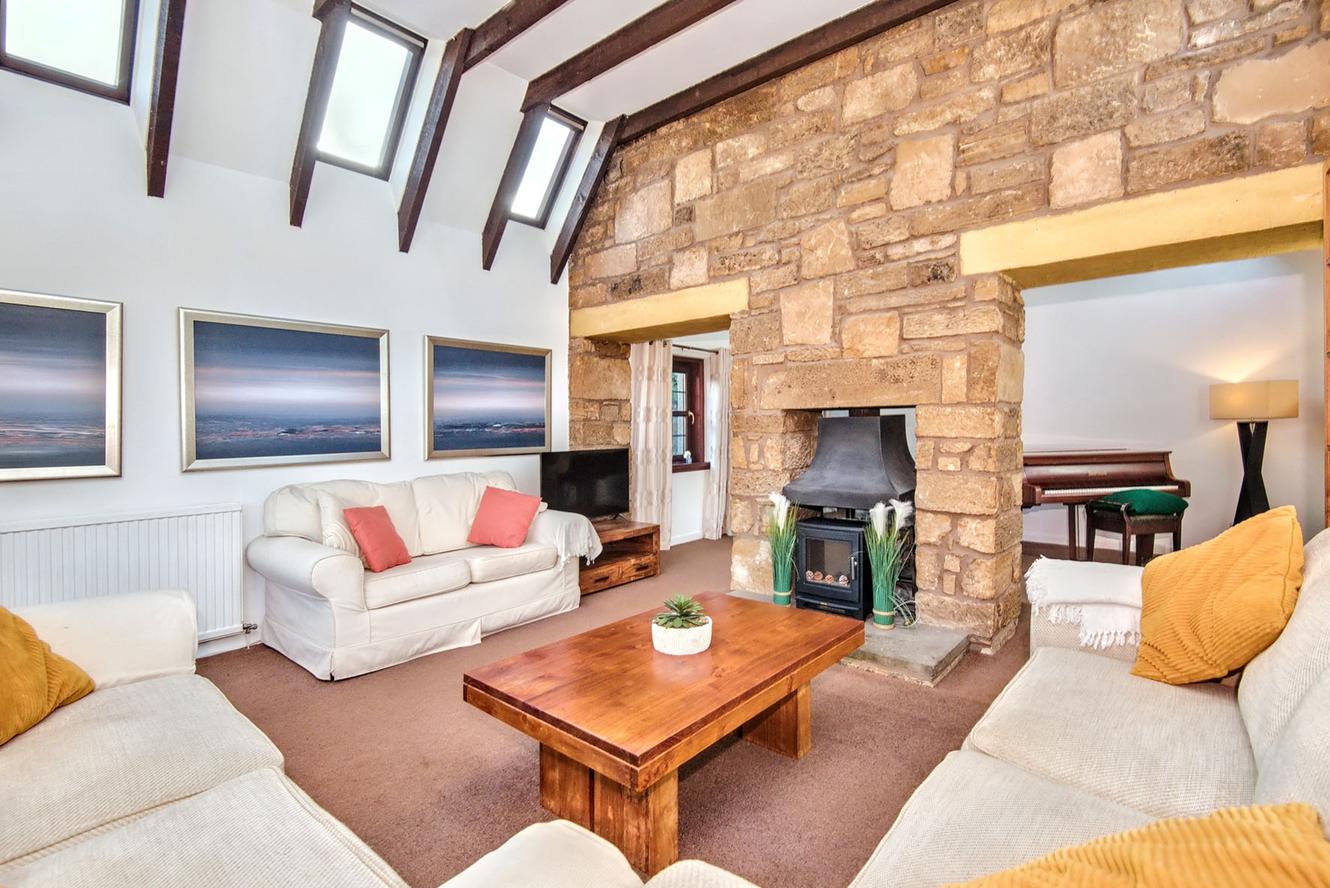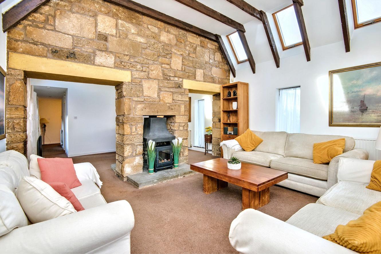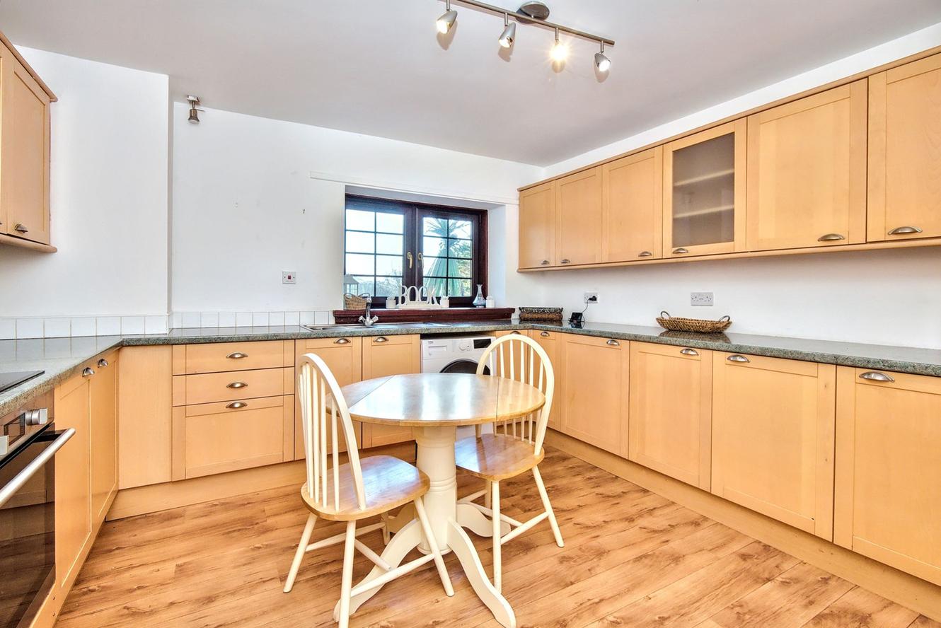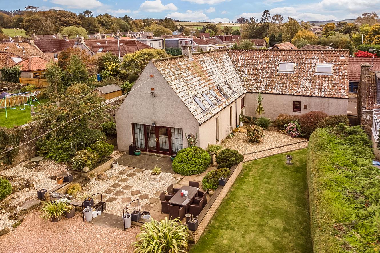 Nestled in the picturesque Howe of Fife, this four-bedroom detached house offers both tranquillity and convenience, being close to amenities in Glenrothes and Cupar, including mainline rail links. The traditional stone façade conceals a modern, spacious home with a neutral, easily personalised backdrop. Spanning three floors, it features multiple bathrooms and living areas, making it a superior family home, complemented by a large, well-maintained garden that overlooks open countryside. Additionally, there is superb private parking, including a sizeable garage. The naturally lit and generous hallway gives access to all of the ground floor accommodation and flows openly into the generous main reception room—a spectacular space with defined zones for relaxation and dining, separated by the striking feature of a natural stone wall with a double-sided open fireplace. It boasts a vaulted ceiling with exposed beams and is filled with natural light from multi-aspect glazing, including numerous roof lights and French doors leading to the garden. The modern, wood-toned kitchen is adjacent to the reception room, centred around a social breakfasting area.