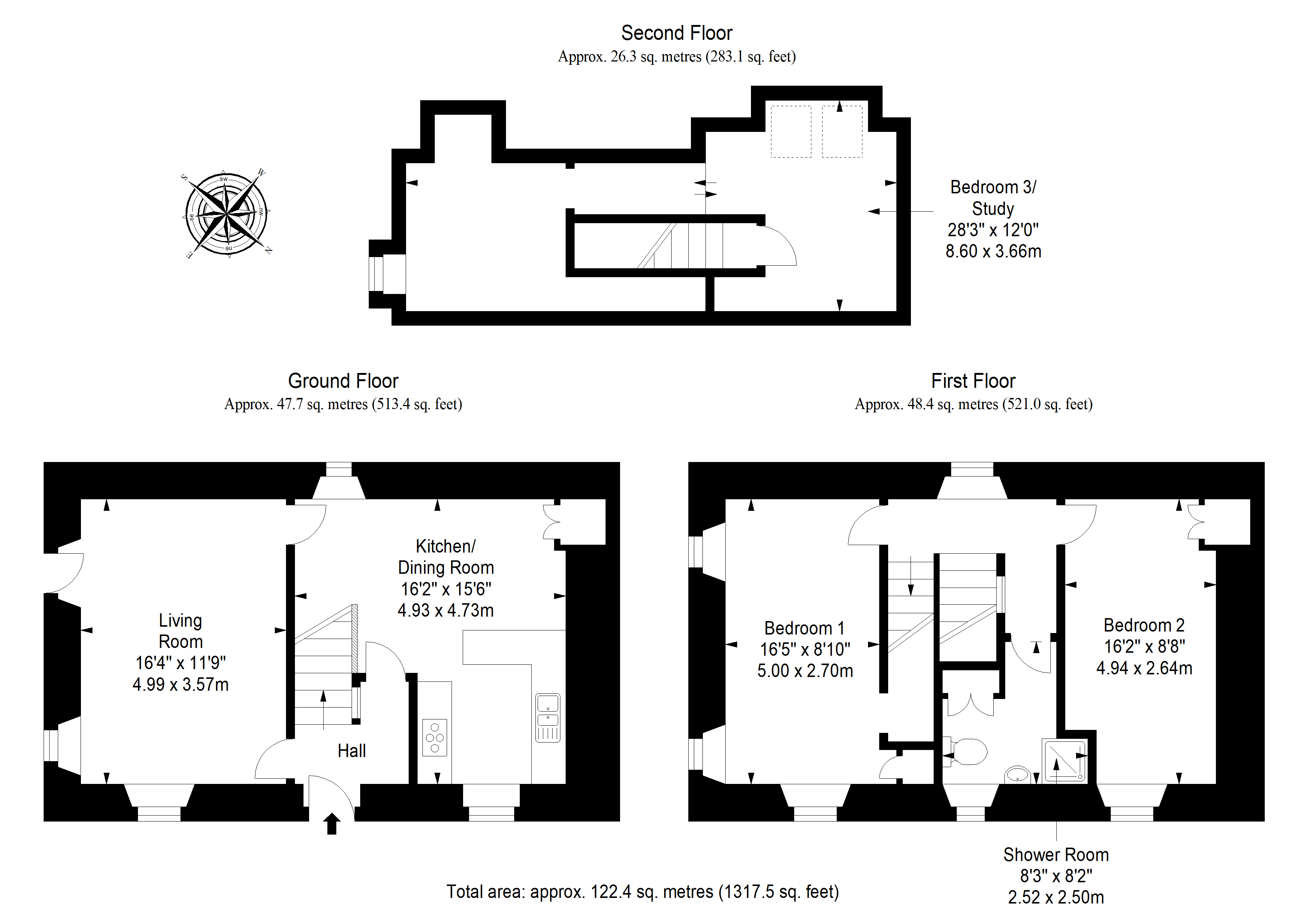 The ground floor comprises a welcoming hall, a bright and spacious living room, and an open-plan kitchen/dining room fitted with contemporary cabinetry and ample worktop space. The first floor provides two generous double bedrooms and a stylish shower room. The second floor hosts a substantial third bedroom/study within the attic level, offering excellent versatility as a principal bedroom, home office or hobby space.