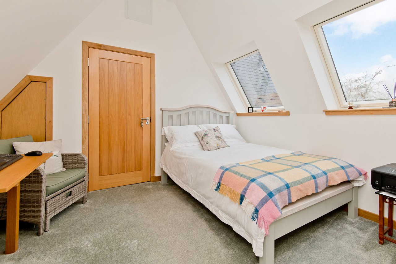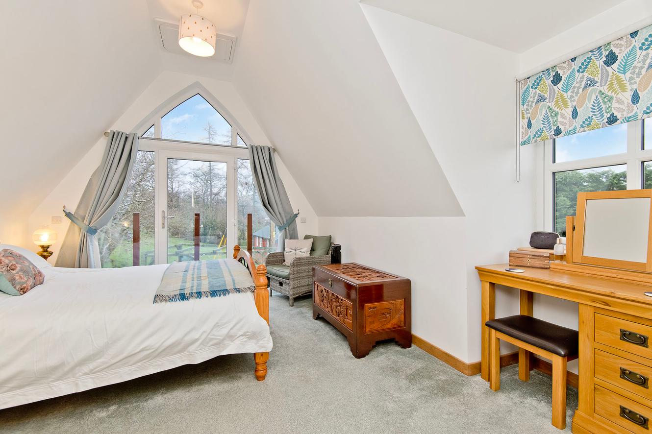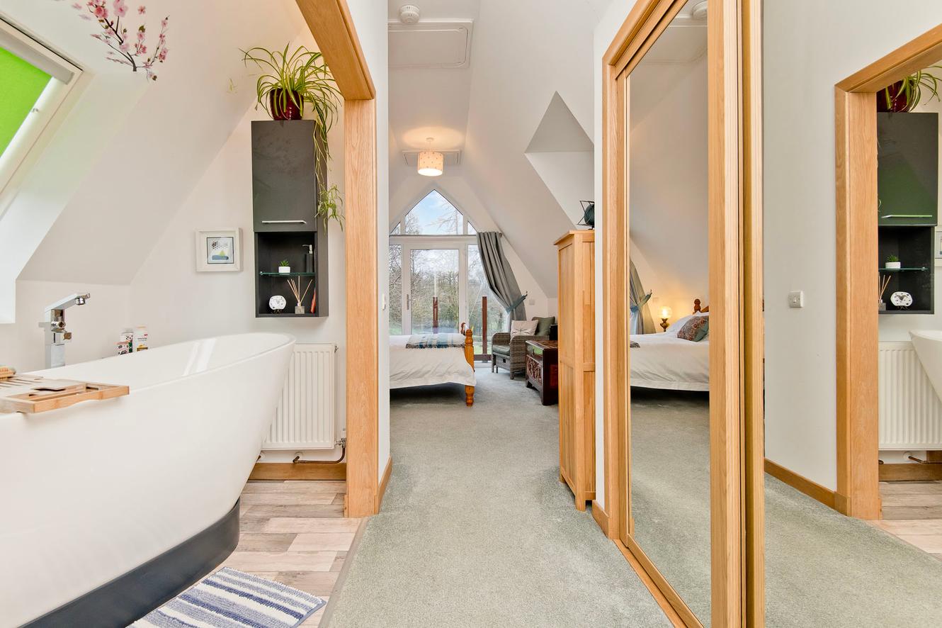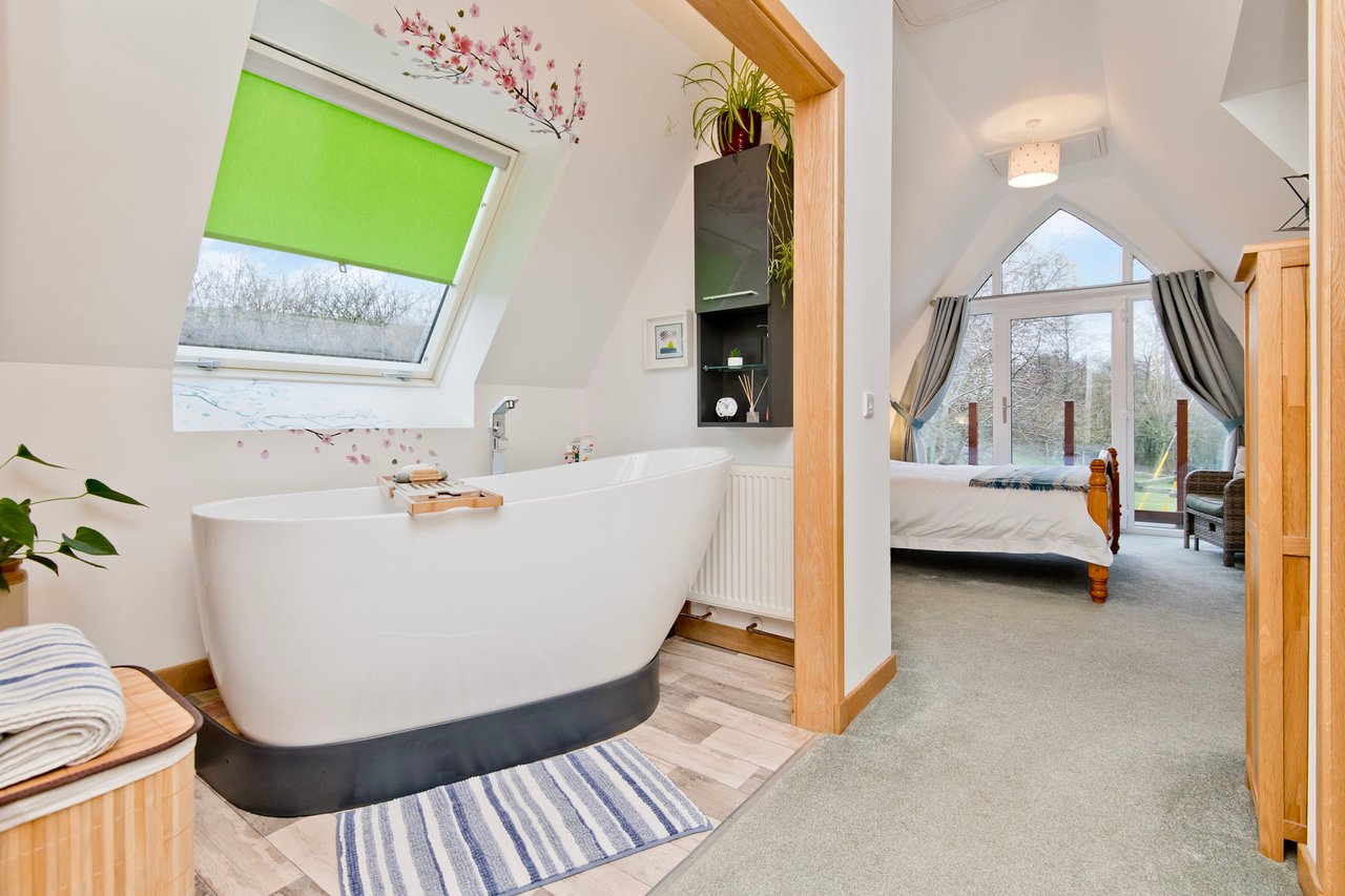 The two bedrooms maintain the impeccable decorative standard, each finished with soft carpets and built in wardrobes for added comfort and convenience. The dual aspect principal suite is particularly impressive, featuring a near full height apex window and glazed door opening out onto a private balcony with garden views. It also benefits from attic access and a luxurious three-piece en suite bathroom with a deep freestanding slipper bathtub, offering a spa like retreat. The second bedroom enjoys its own modern en suite shower room as well. Furthermore, this bedroom links directly to the self contained annexe, enabling the latter to function seamlessly as part of the main residence if desired.