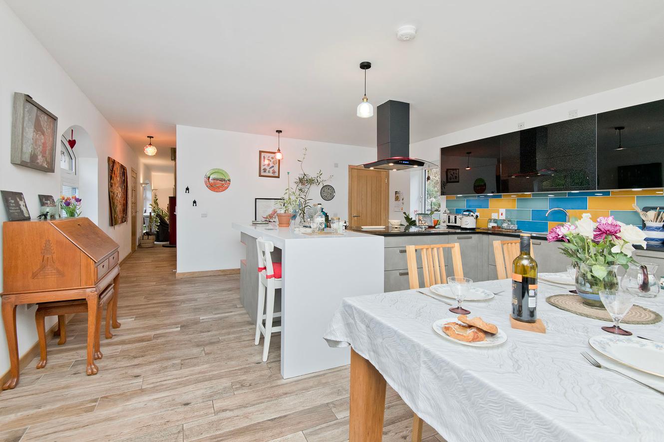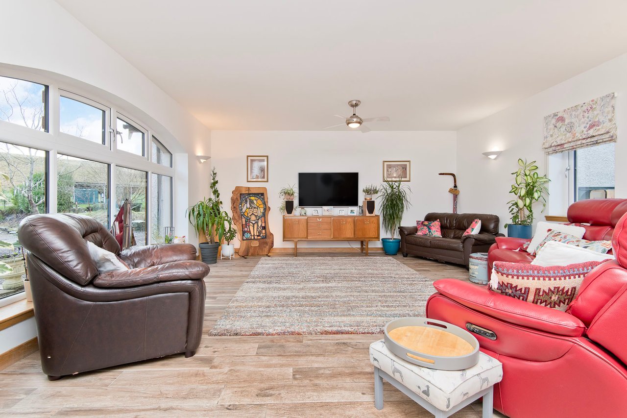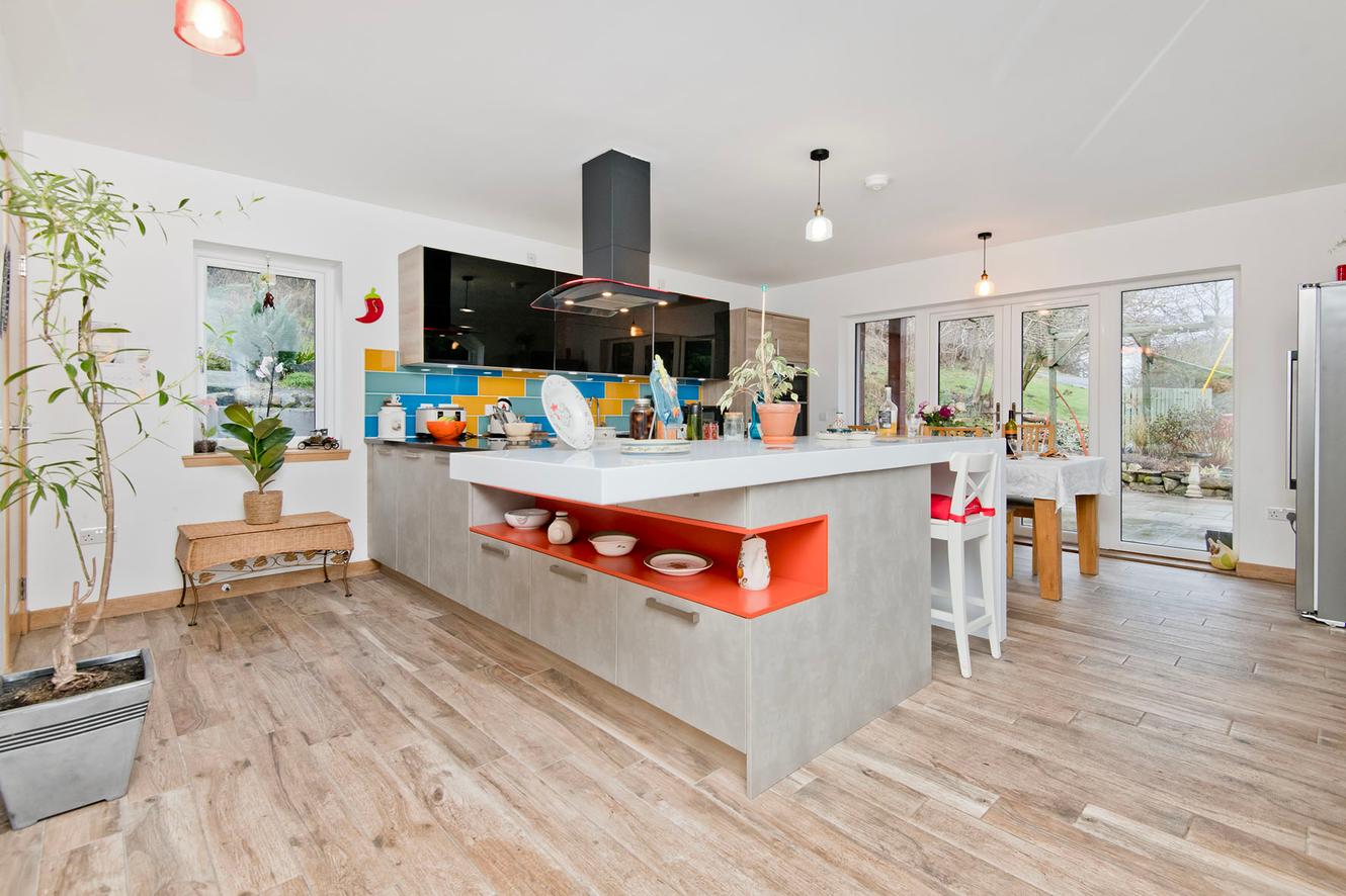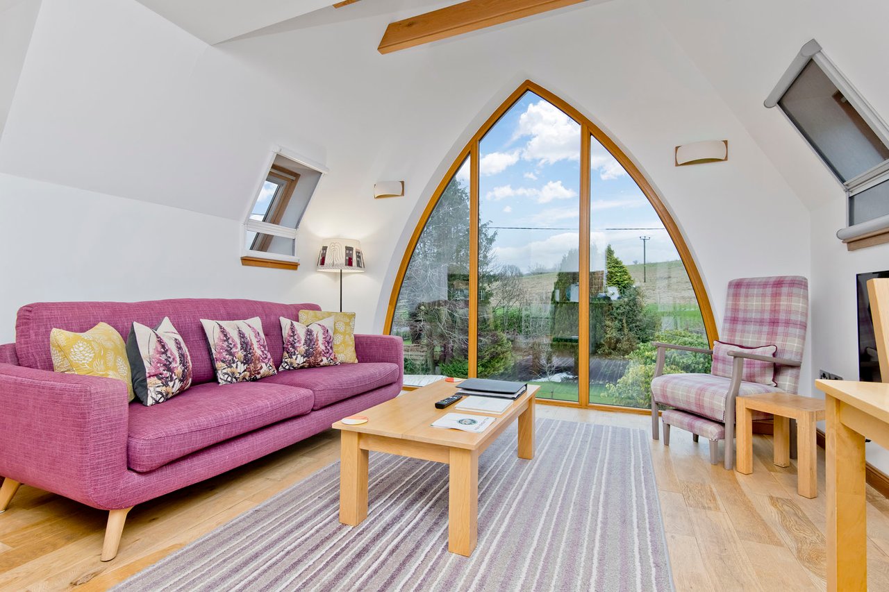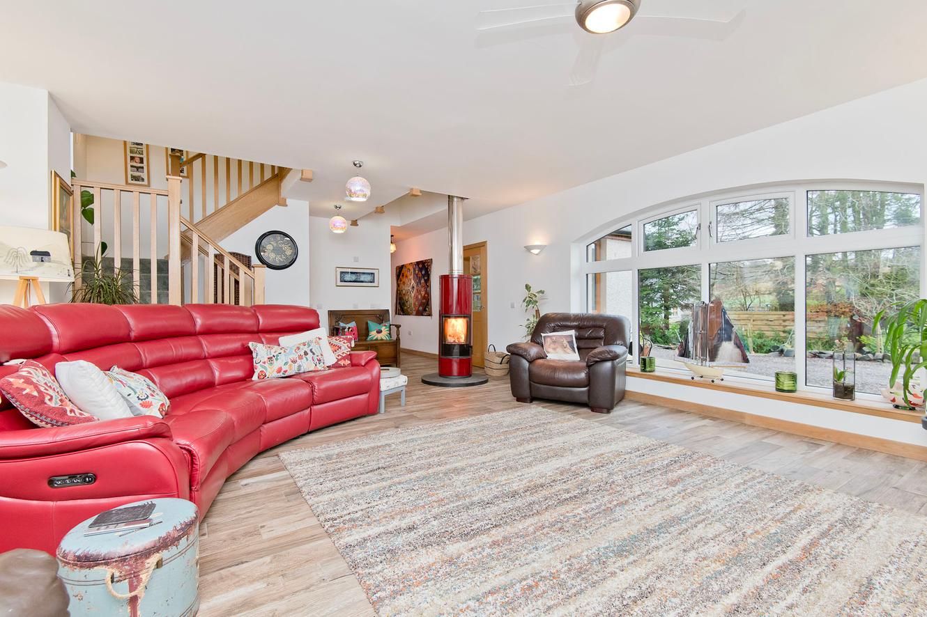 The dual aspect living room is the embodiment of style and elegance. Its expansive footprint accommodates a generous array of comfortable seating, while a modern Italian log burning stove adds warmth and character. Yet it is the magnificent arched window that truly commands attention. This eye catching architectural feature bathes the room in sunlight and offers a refined frame to the vibrant scenery beyond.