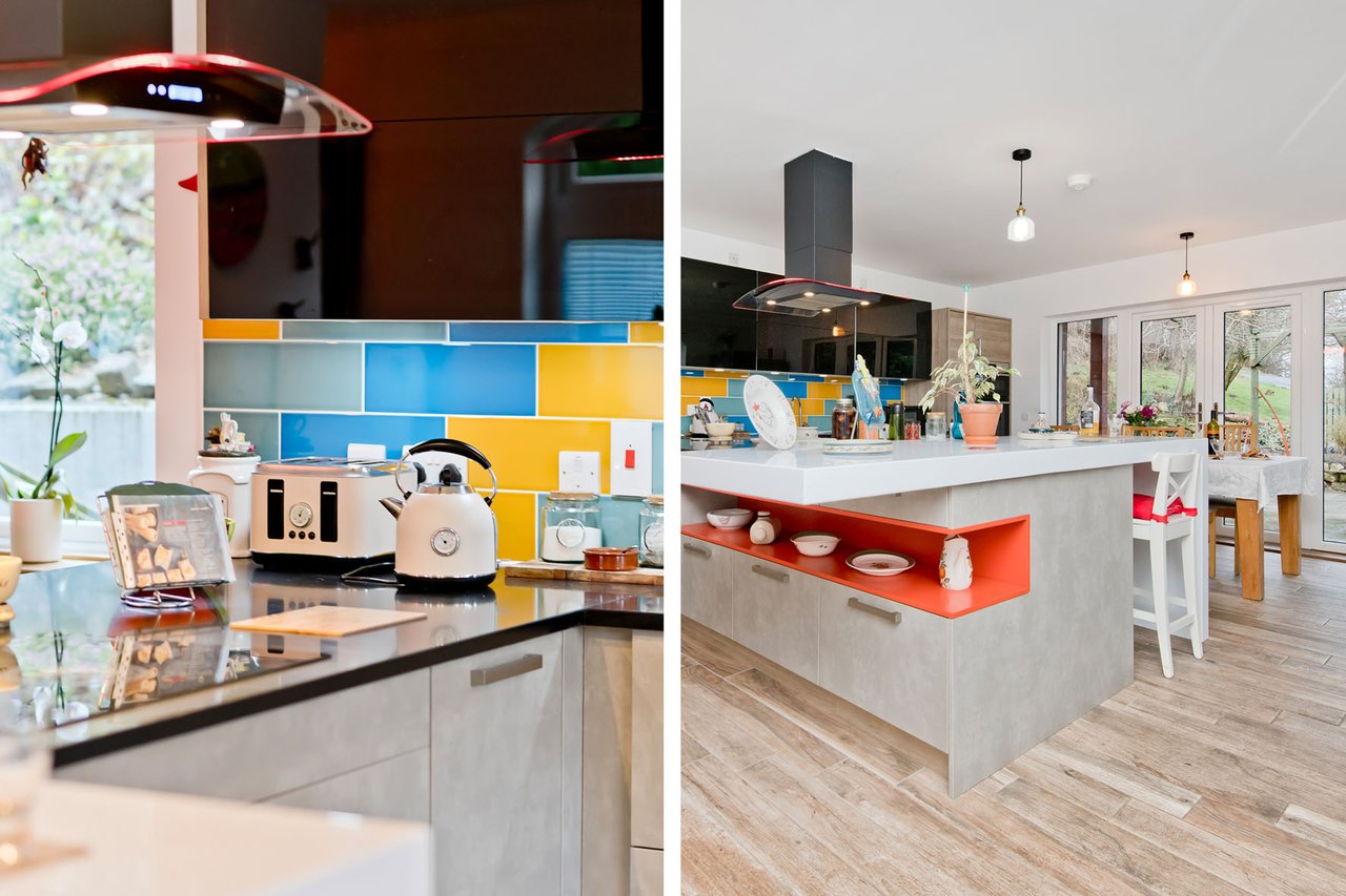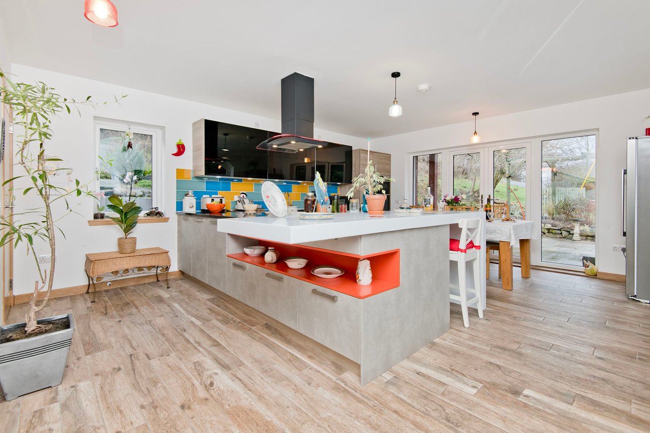 The German designer dining kitchen is a masterclass in contemporary styling, combining mix and match cabinet tones with multi coloured splashbacks and sleek worktops. A fitted breakfast bar adds functionality, while integrated appliances ensure a streamlined finish (ceramic hob, extractor hood, and double oven). The spacious layout also accommodates a dedicated dining area beside French doors that open directly onto the garden patio. A neighbouring utility room provides additional storage and everyday practicality.