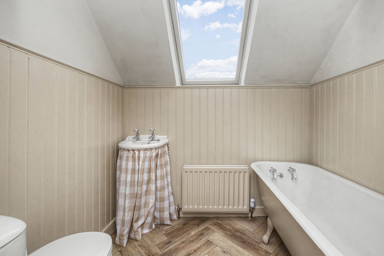 Also on the first level is a well-proportioned second bedroom together with a bathroom and separate WC. A staircase leads to the upper floor where a generous principal bedroom, enhanced by sloping ceilings and a skylight window that allows for excellent natural light.
