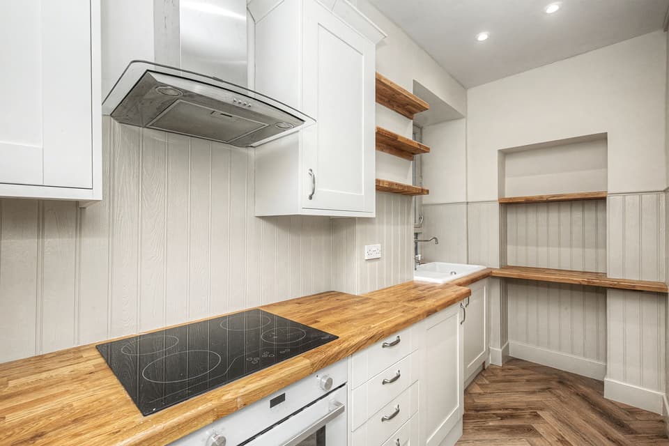 Accessed via a shared entrance and stair, the property opens to a welcoming hall leading to a spacious living and dining room with built-in storage. The accommodation also includes a modern fitted kitchen with contemporary cabinetry, wood worktops and integrated cooking appliances.