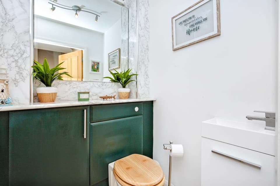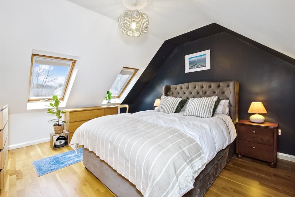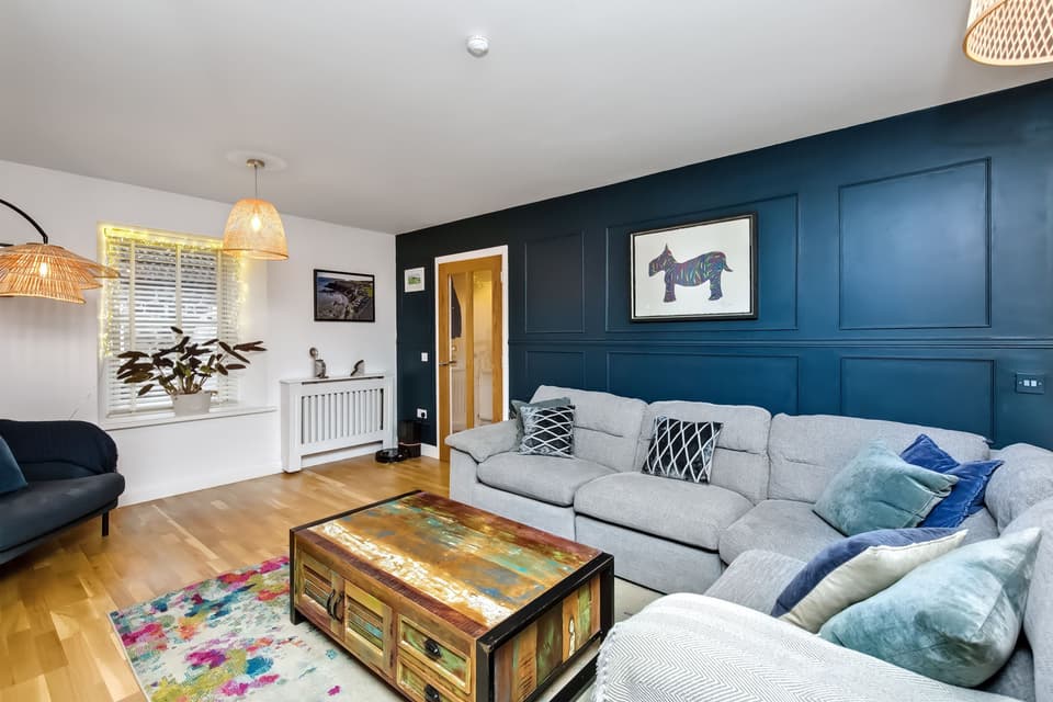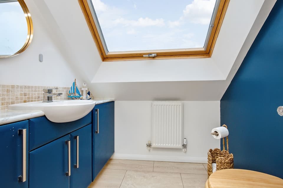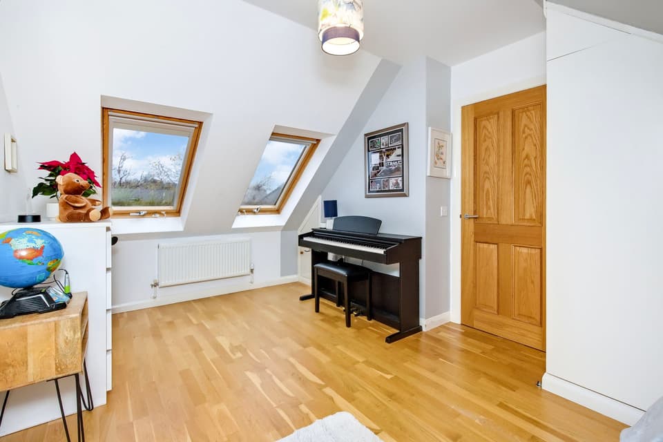 Upstairs, the master bedroom boasts eaves storage, while the second bedroom features a Velux window and built-in wardrobes. A generous third bedroom offers additional storage, W/C and the stylish four-piece family bathroom completes the accommodation.