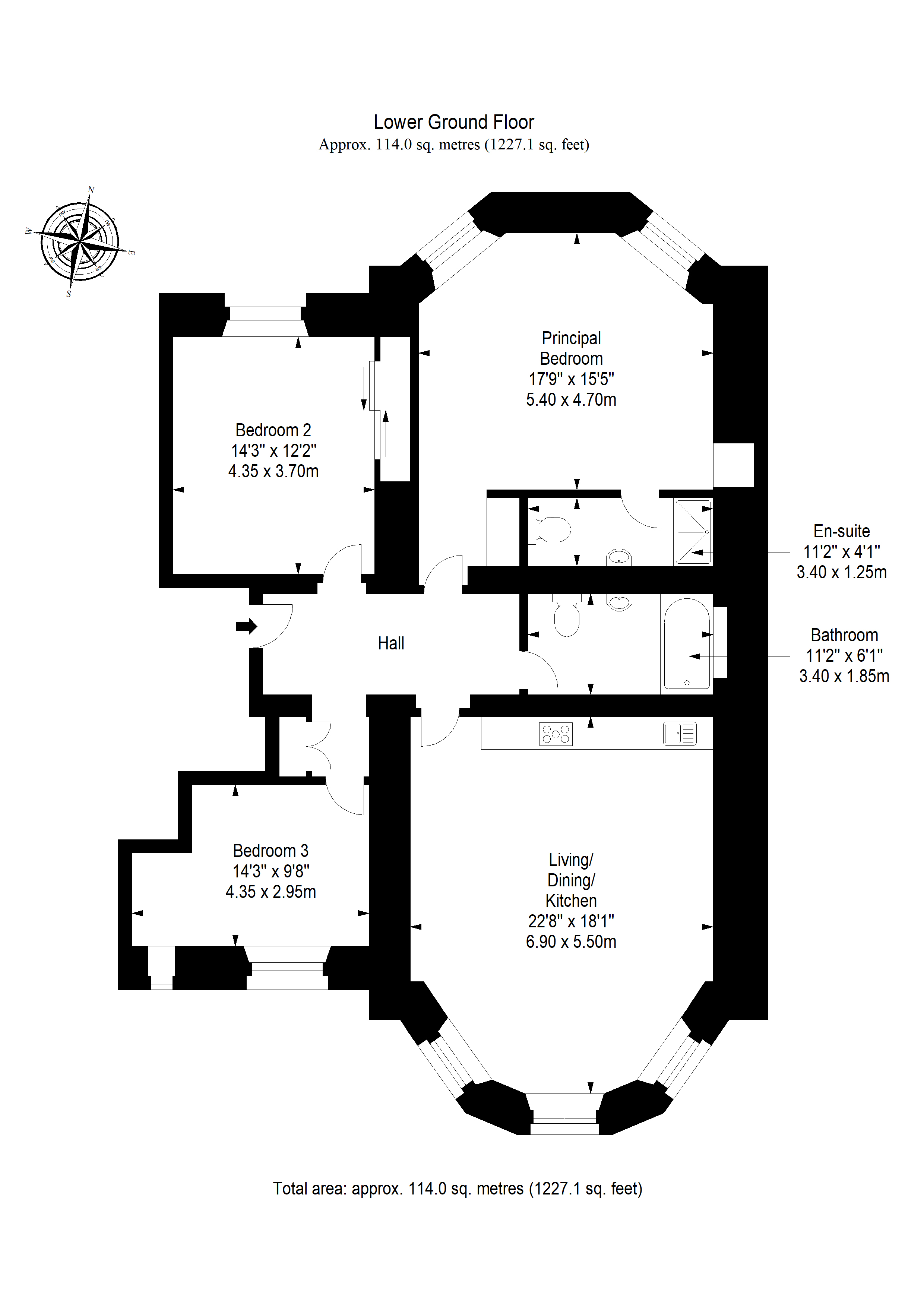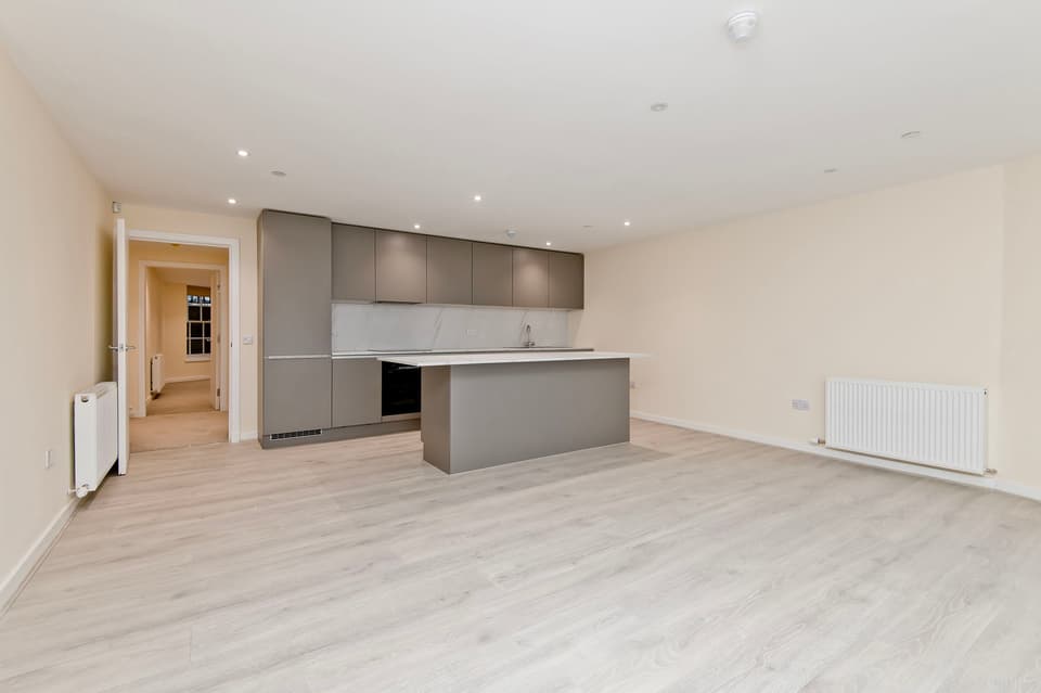 This lower-ground-floor apartment extends to approximately 114 square metres and offers three double bedrooms, including a principal bedroom with twin windows and an en-suite shower room. A second bedroom features fitted wardrobes, while the third enjoys a peaceful rear position. An open-plan reception room and kitchen benefit from triple river-facing windows, with a bathroom featuring a bath and overhead shower, and cloak storage in the hall, completing this standout family home.