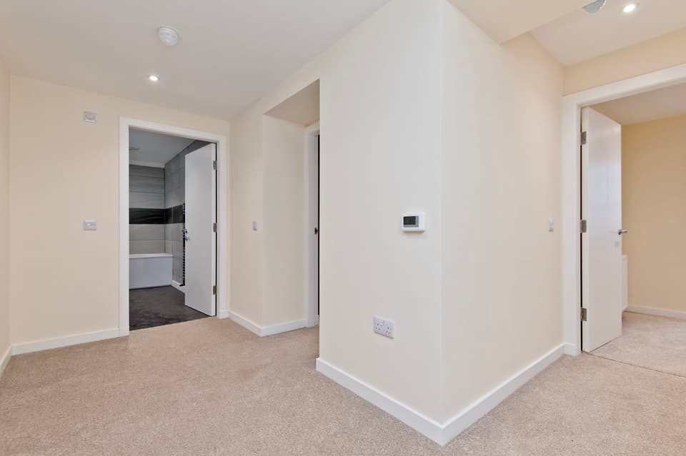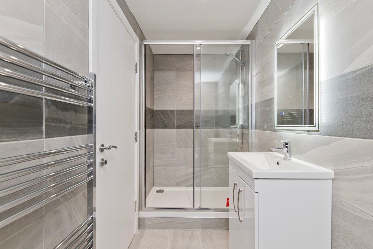 Kitchens are fully integrated and supplied by Selan Design of Broughty Ferry, featuring premium appliances and clean-lined cabinetry. Bathrooms and en-suites are also finished to a high standard, with elegant bath suites, rainfall showers, and practical storage. One apartment is further distinguished by an ornate ceiling rose and decorative cornicing within the main living space, providing a striking link to the building’s historic origins.