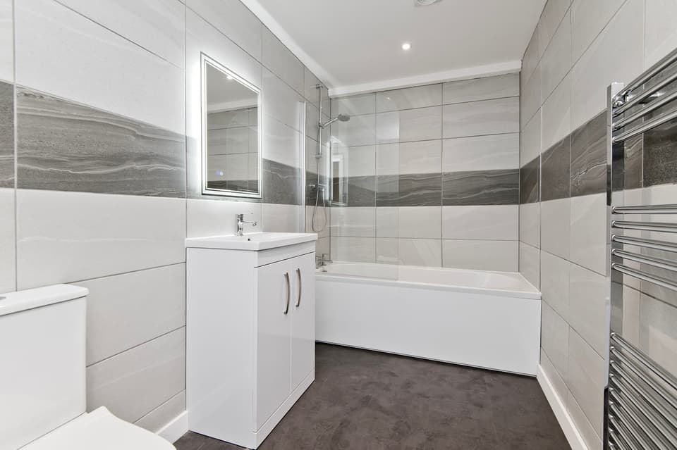 Bathrooms and en-suites with baths, rainfall showers, and storage