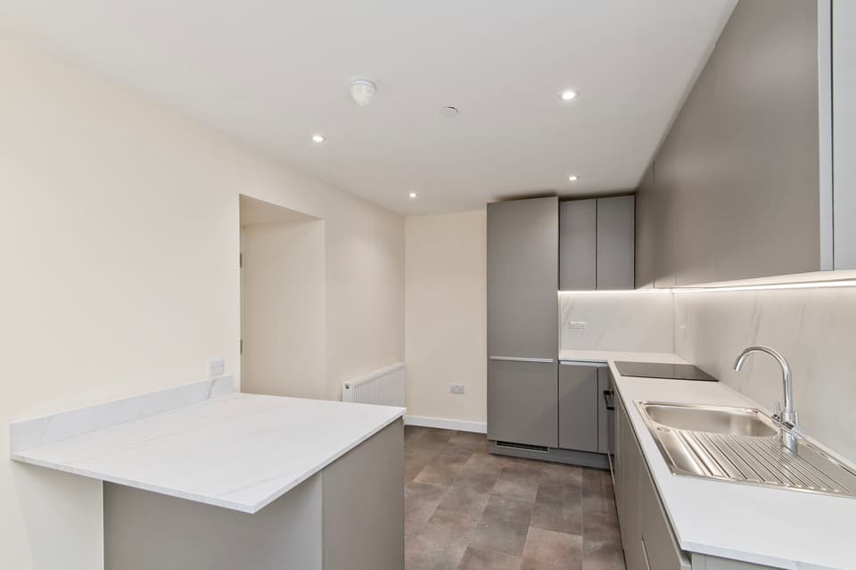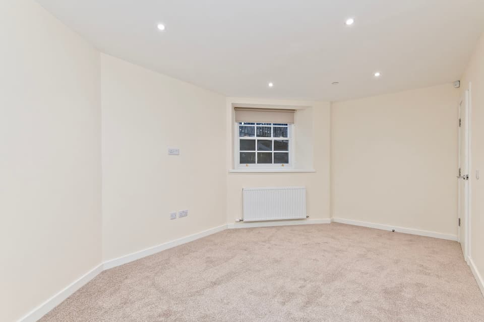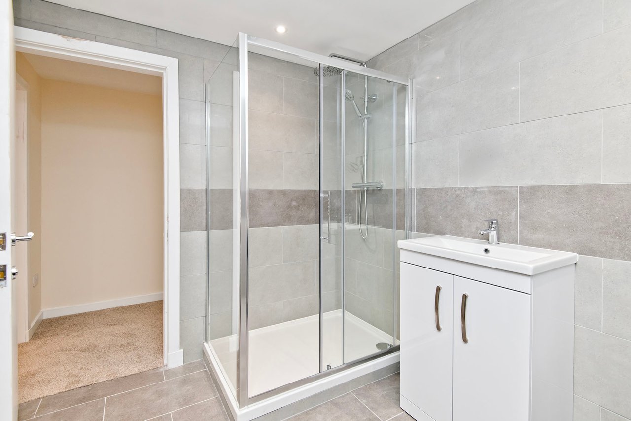Kitchens are fully integrated and supplied by Selan Design of Broughty Ferry, featuring premium appliances and clean-lined cabinetry. Bathrooms and en-suites are also finished to a high standard, with elegant bath suites, rainfall showers, and practical storage. One apartment is further distinguished by an ornate ceiling rose and decorative cornicing within the main living space, providing a striking link to the building’s historic origins.