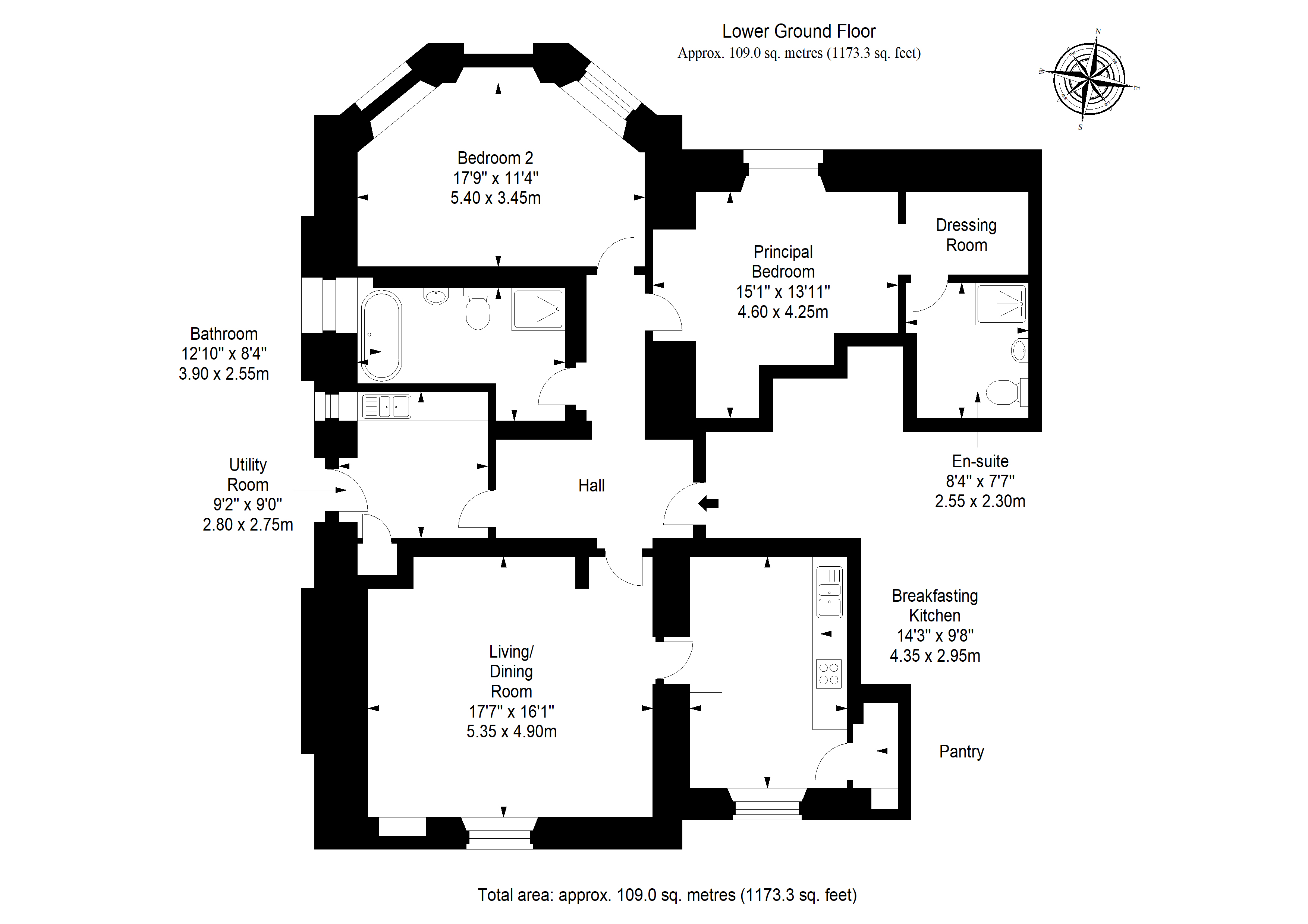 Extending to approximately 109 square metres, the second lower-ground-floor apartment offers two double bedrooms, including a generous principal suite with an en-suite shower room and dressing room. The reception room enjoys a river-facing position and connects to a kitchen with a breakfast peninsula and pantry. A bathroom with bath and separate shower, and a practical utility room with access to the garden grounds, complete the accommodation.