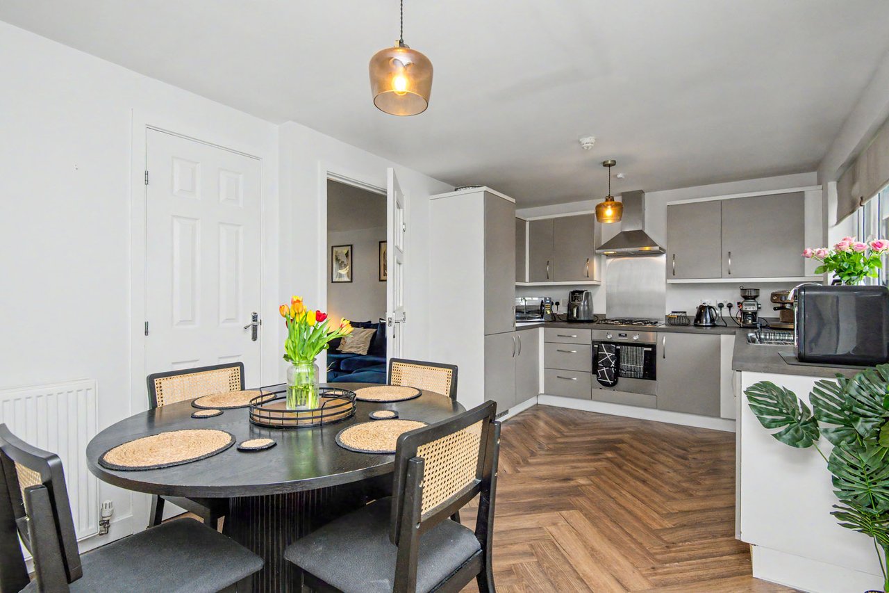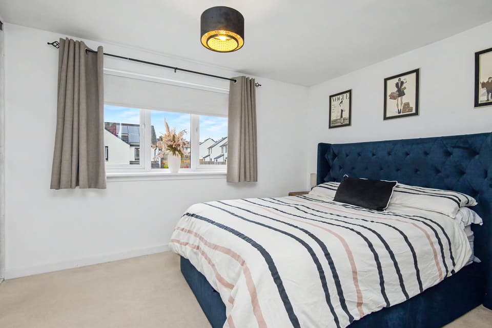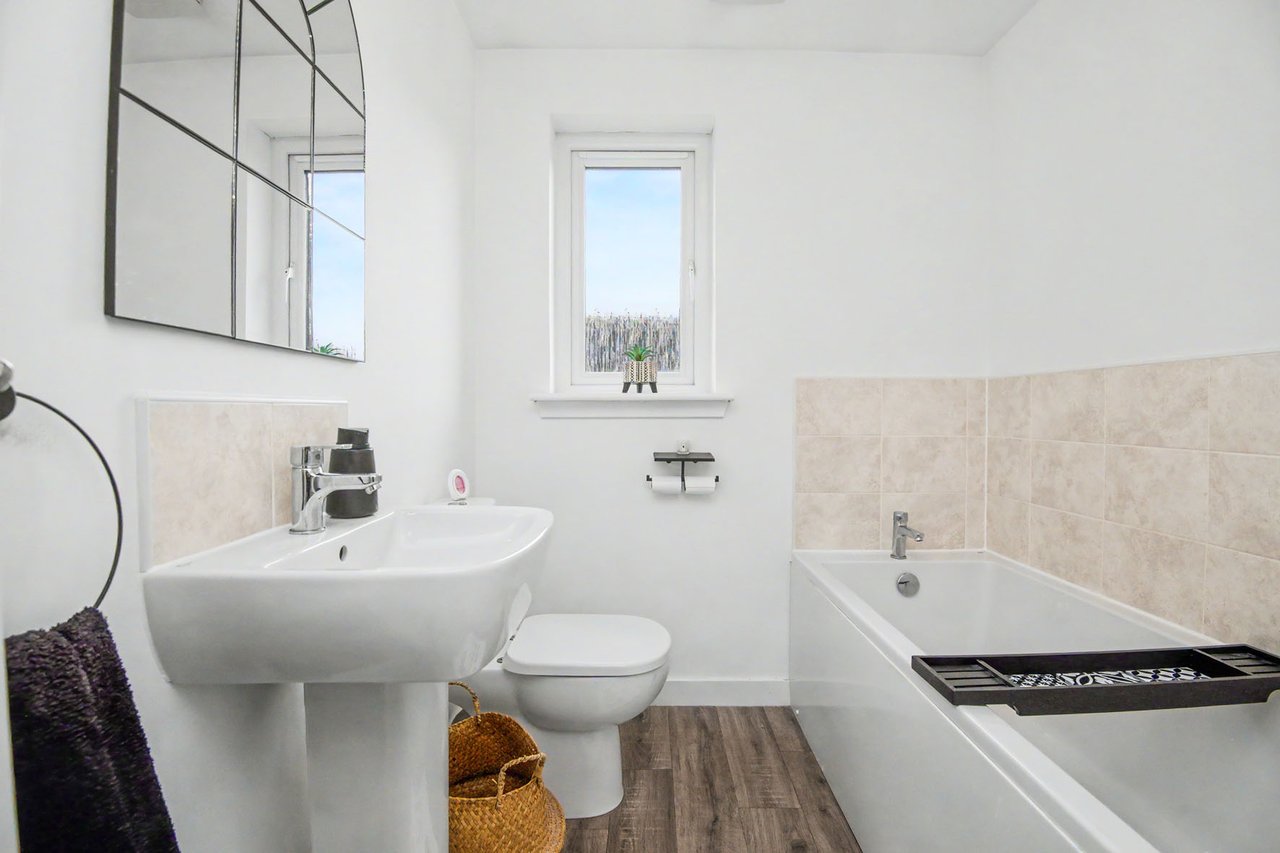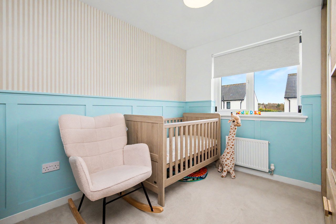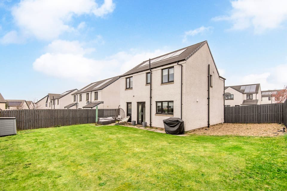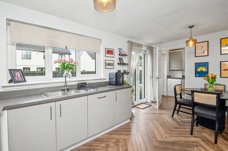 This elegant detached home forms part of a modern residential development in Dundee, offering beautifully balanced and versatile accommodation. The property opens with a welcoming hall and stairwell, leading to a spacious living room and a bright kitchen/dining area with patio doors opening onto the garden, alongside a practical utility room and guest WC. The upper level hosts a generous principal bedroom with an en-suite, three further bedrooms (two with built-in storage), and a stylish bathroom with additional storage. Externally, the home benefits from private lawned gardens, a multi-vehicle driveway with garage parking. Extras: All fitted floor and window coverings, light fittings, and integrated appliances are included.