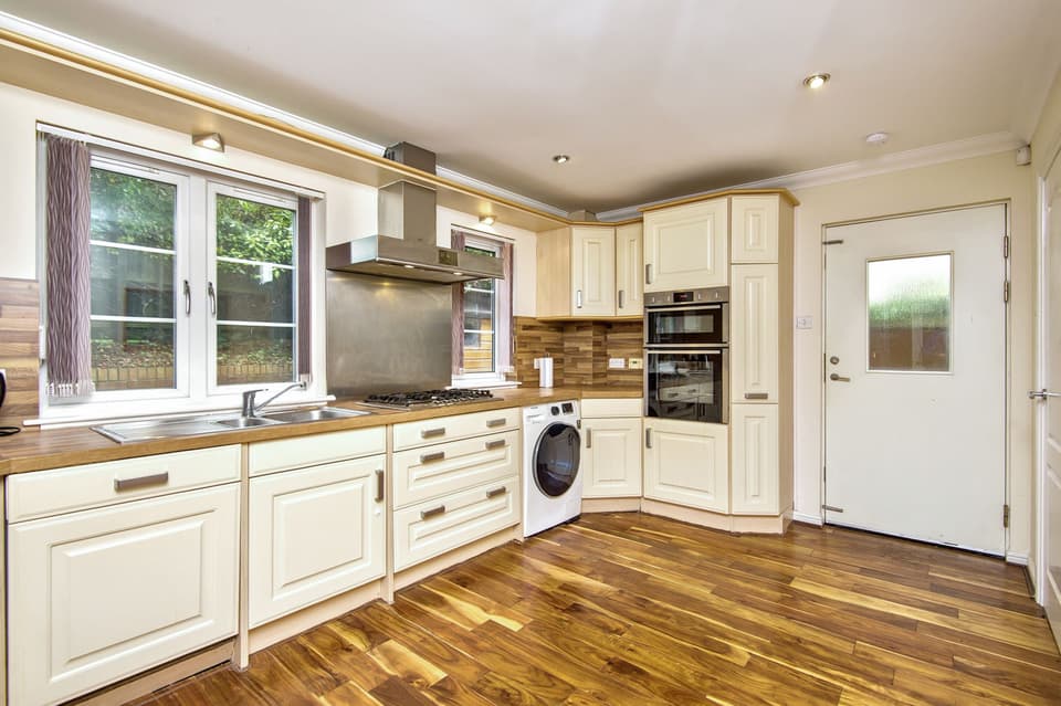 Extras: all fitted floor and window coverings, light fittings, integrated five-burner gas hob, double oven, and dishwasher, a freestanding fridge/freezer, and a washing machine are included.