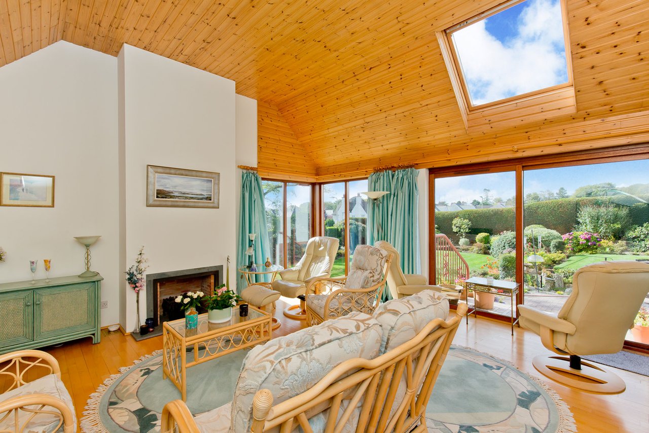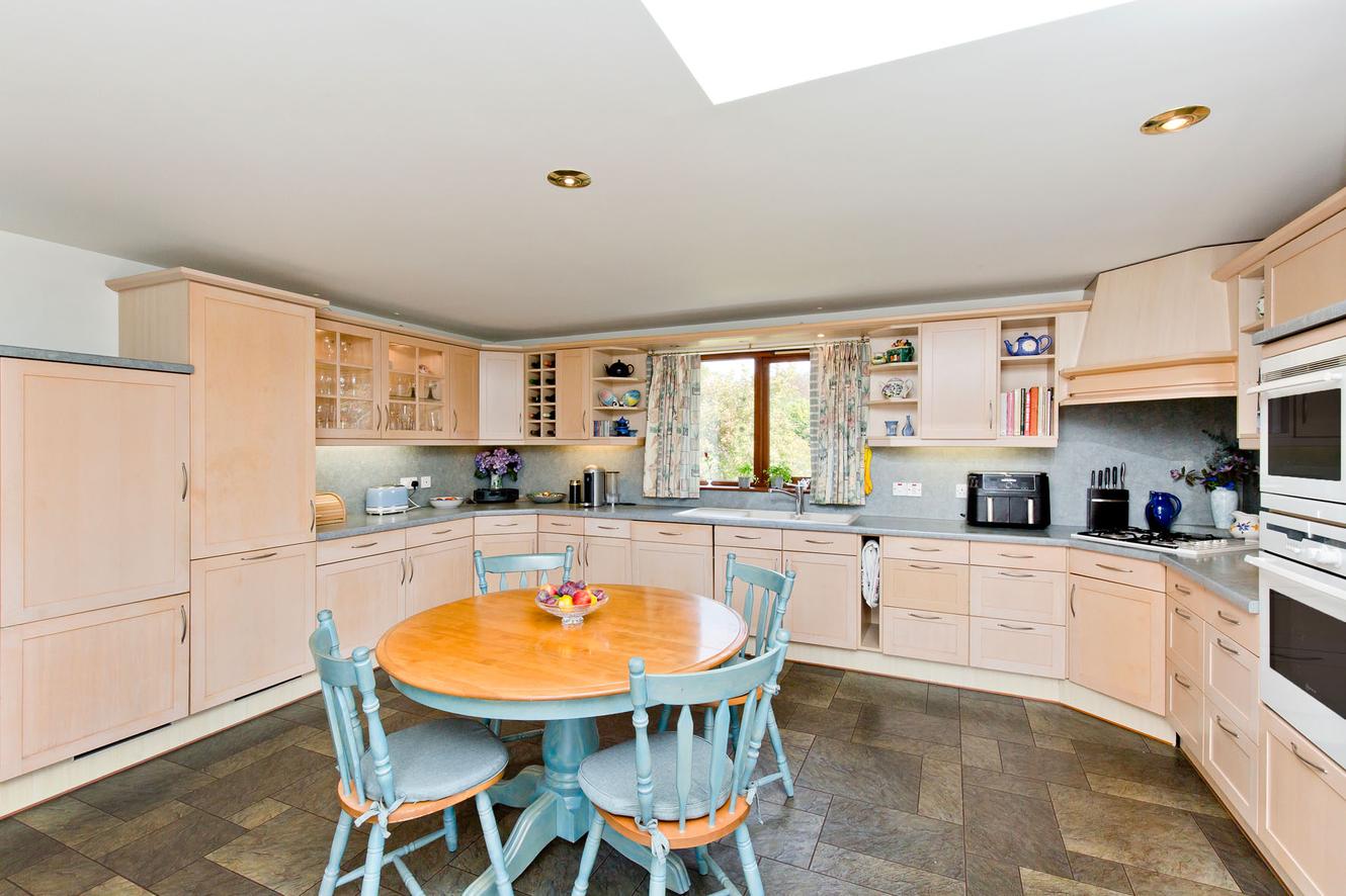 A delightful sunroom is connected to the kitchen, offering the perfect space to retreat and relax after meals and boasting a wealth of glazing allowing natural light to stream in throughout the day and framing views of, as well as affording access to, the garden.