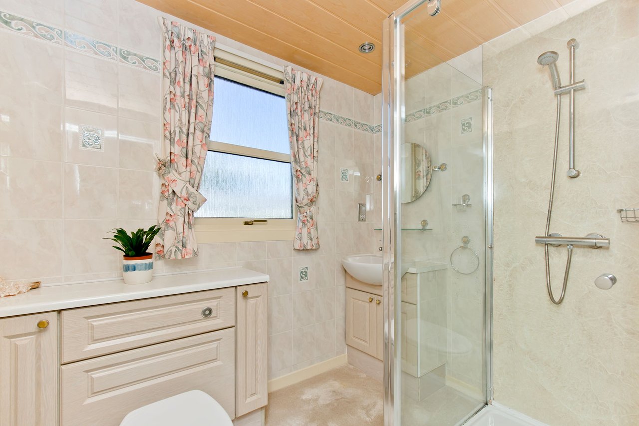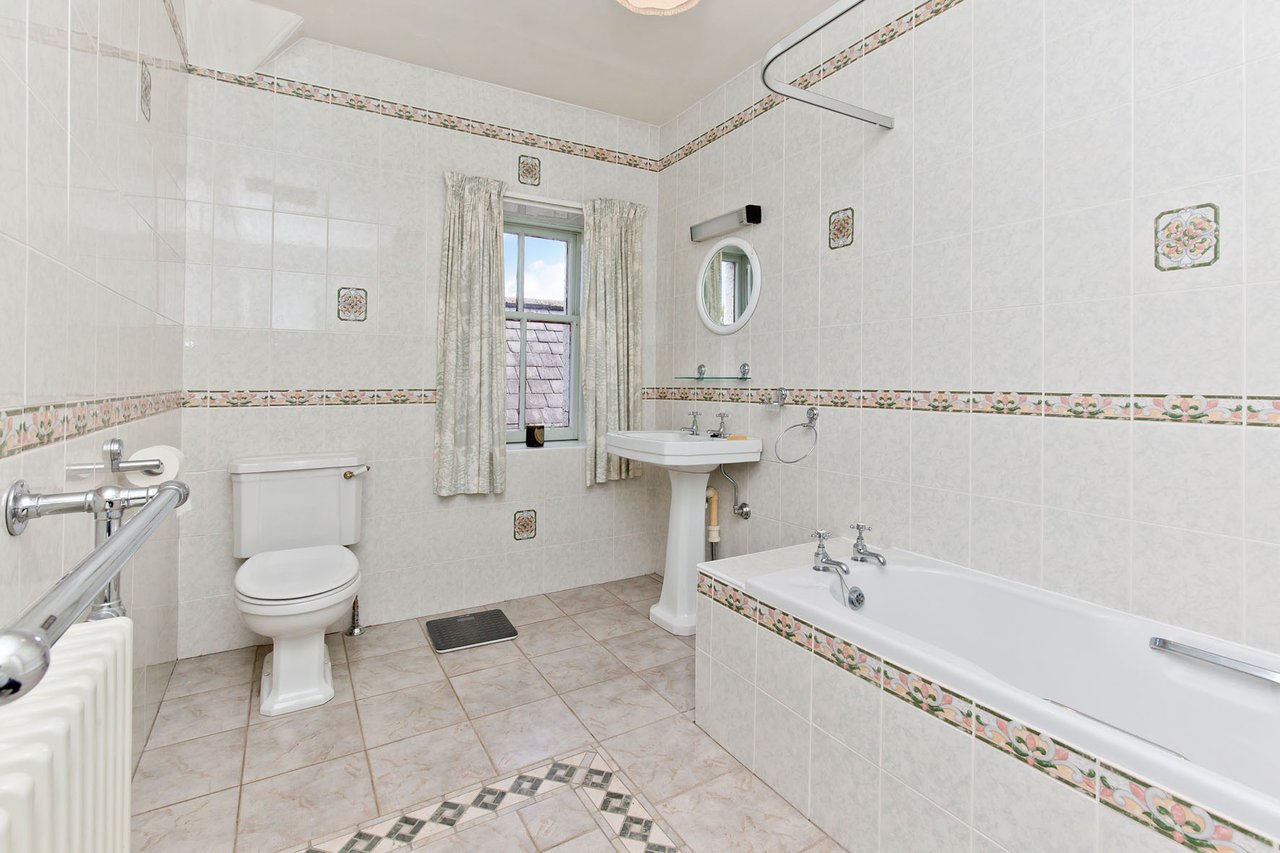 The principal bedroom’s en-suite comprises a large corner shower enclosure, a basin, a WC, and vanity storage, whilst a bright bathroom completes the accommodation on offer and features a bath with an overhead shower and a traditionally styled WC-suite.