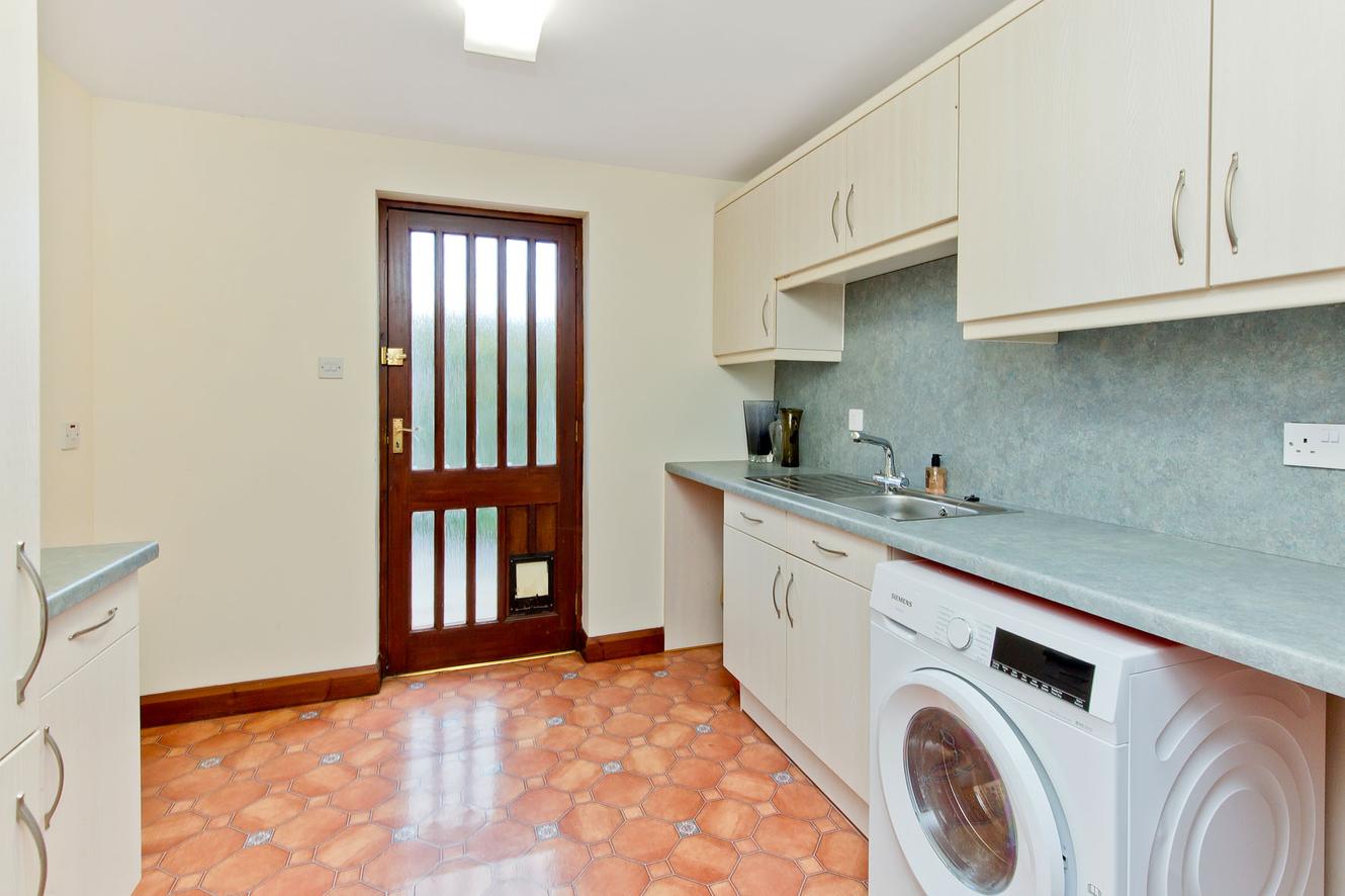 The kitchen is appointed with a wide range of cabinetry, plentiful workspace, and splashback panels, with integrated appliances comprising an oven and combination microwave oven, a gas hob, an extractor fan, a fridge, a freezer, and a dishwasher. The kitchen also has plenty of space for a central seated dining area which is ideal for casual meals, morning coffee, and socialising while cooking, whilst a separate utility room (with external access) houses additional cabinets and workspace, a sink, and space for a washing machine.