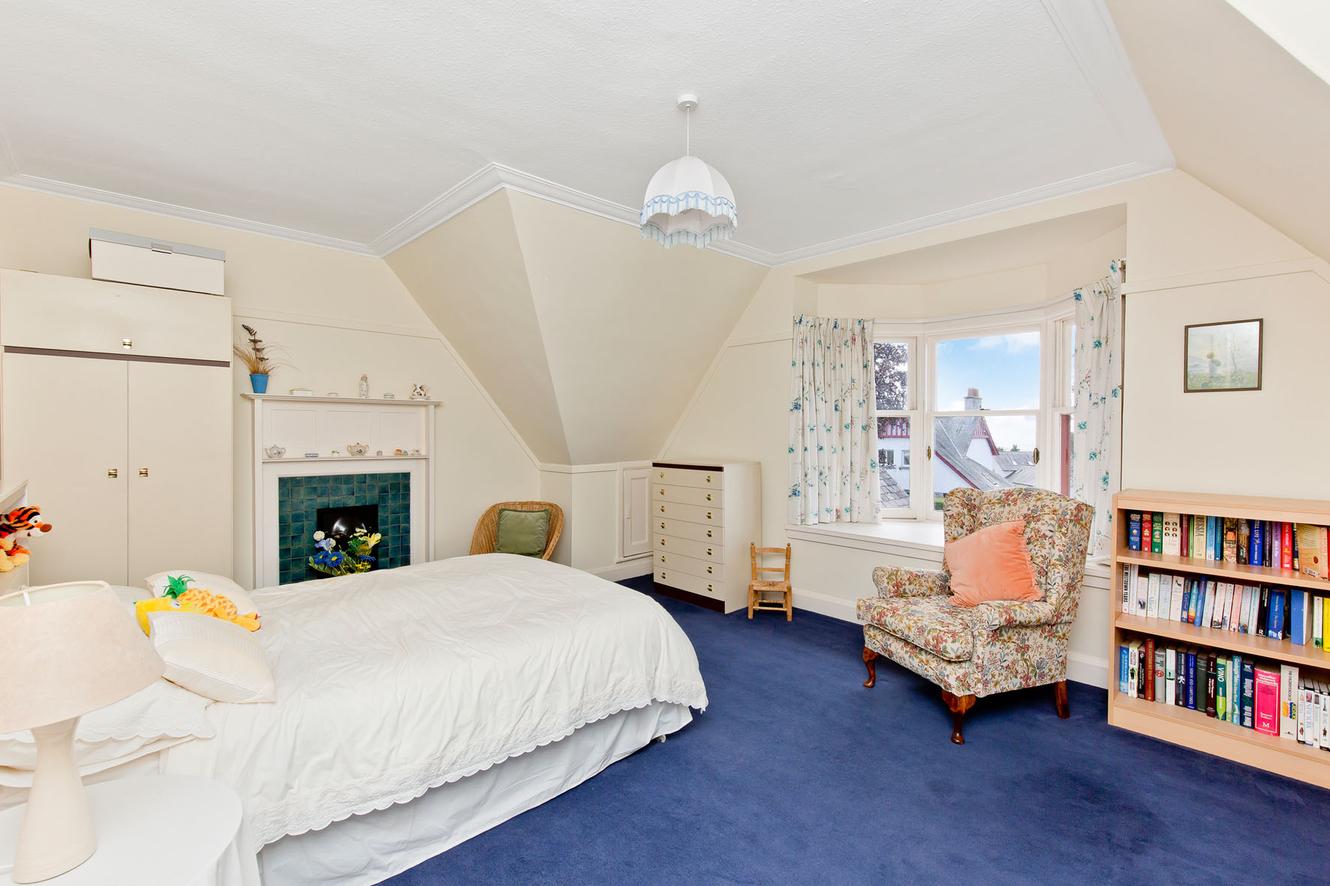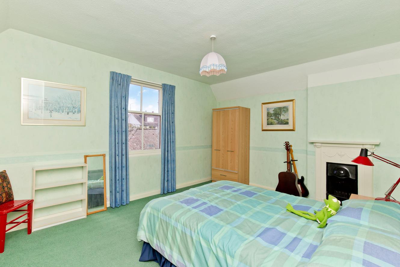The home’s four bedrooms are all on the first floor, approached via a landing with built-in storage, and consist of four bright and spacious doubles. The particularly generous, dual-aspect principal bedroom is supplemented by a built-in wardrobe and an en-suite shower room, whilst the remaining three bedrooms feature characterful fireplaces.