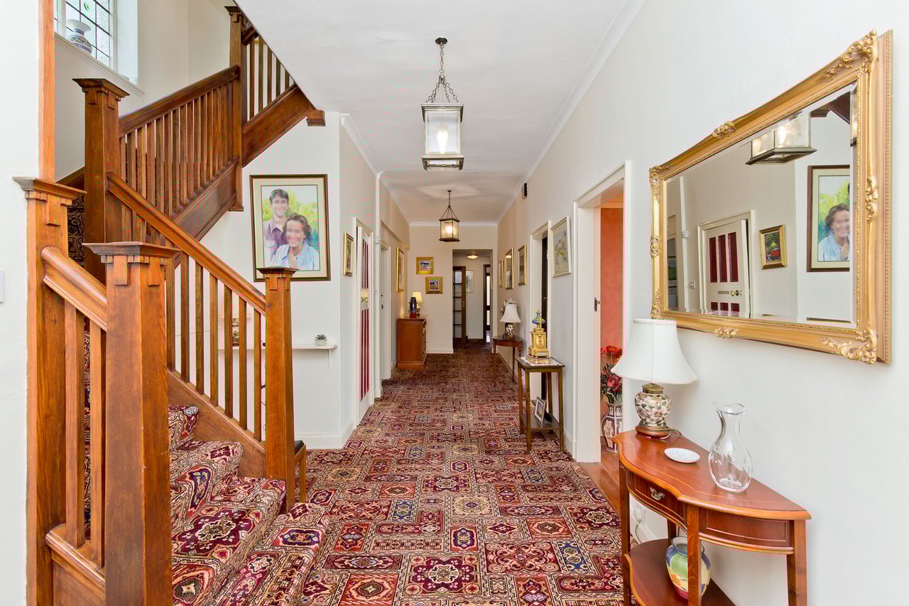 The house is screened from the road by neat hedges and a sweeping driveway creates a welcoming approach. The front door opens into a practical entrance vestibule, flowing through to a long, wide hall with built-in storage and a useful WC.